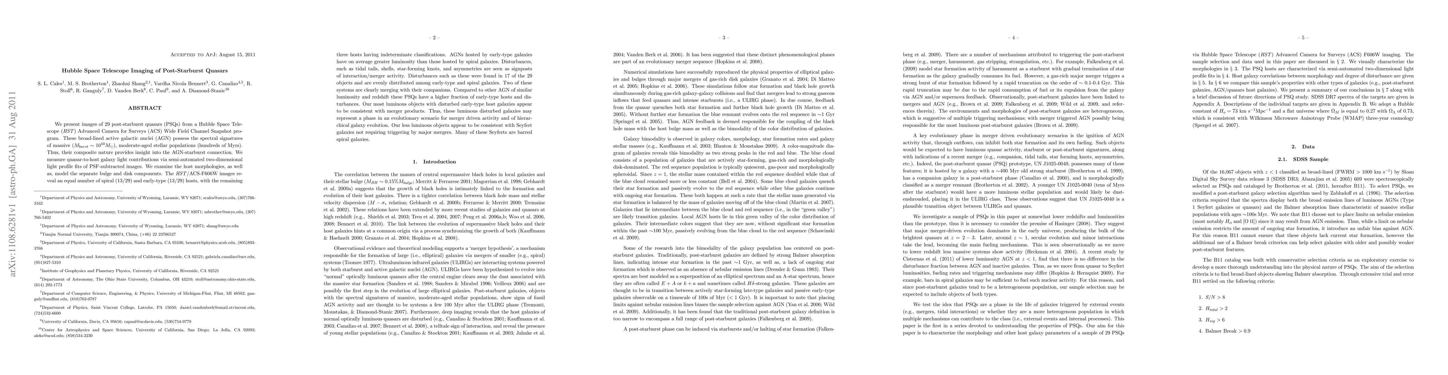 We present images of 29 post-starburst quasars (PSQs) from a Hubble Space Telescope (\emph{HST}) Advanced Camera for Surveys (ACS) Wide Field Channel Snapshot program. These broad-lined active galactic nuclei (AGN) possess the spectral signatures of massive ($M_{burst} \sim 10^{10} M_{\odot}$), moderate-aged stellar populations (hundreds of Myrs). Thus, their composite nature provides insight into the AGN-starburst connection. We measure quasar-to-host galaxy light contributions via semi-automated two-dimensional light profile fits of PSF-subtracted images. We examine the host morphologies, as well as, model the separate bulge and disk components. The \emph{HST}/ACS-F606W images reveal an equal number of spiral (13/29) and early-type (13/29) hosts, with the remaining three hosts having indeterminate classifications. AGNs hosted by early-type galaxies have on average greater luminosity than those hosted by spiral galaxies. Disturbances, such as tidal tails, shells, star-forming knots, and asymmetries are seen as signposts of interaction/merger activity. Disturbances such as these were found in 17 of the 29 objects and are evenly distributed among early-type and spiral galaxies. Two of these systems are clearly merging with their companions. Compared to other AGN of similar luminosity and redshift these PSQs have a higher fraction of early-type hosts and disturbances. Our most luminous objects with disturbed early-type host galaxies appear to be consistent with merger products. Thus, these luminous disturbed galaxies may represent a phase in an evolutionary scenario for merger driven activity and of hierarchical galaxy evolution. Our less luminous objects appear to be consistent with Seyfert galaxies not requiring triggering by major mergers. Many of these Seyferts are barred spiral galaxies.