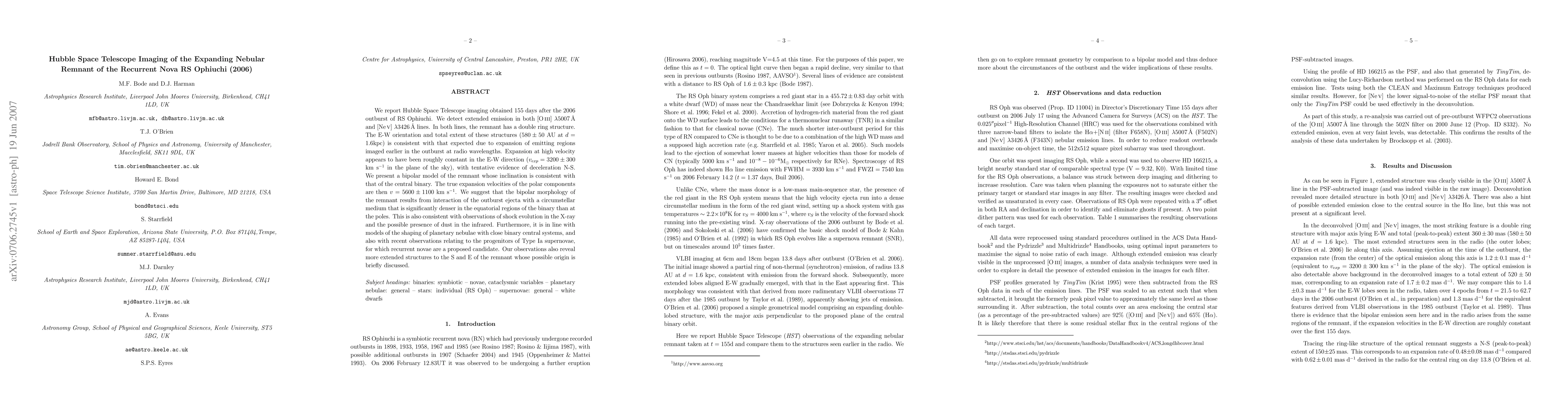 The Hubble Space Telescope imaging of RS Ophiuchi's 2006 recurrent nova reveals a double ring nebula with an E-W orientation and expansion velocity of 3200 km/s, suggesting a bipolar morphology shaped by denser equatorial circumstellar material. The findings align with models of binary systems and progenitors of Type Ia supernovae.
