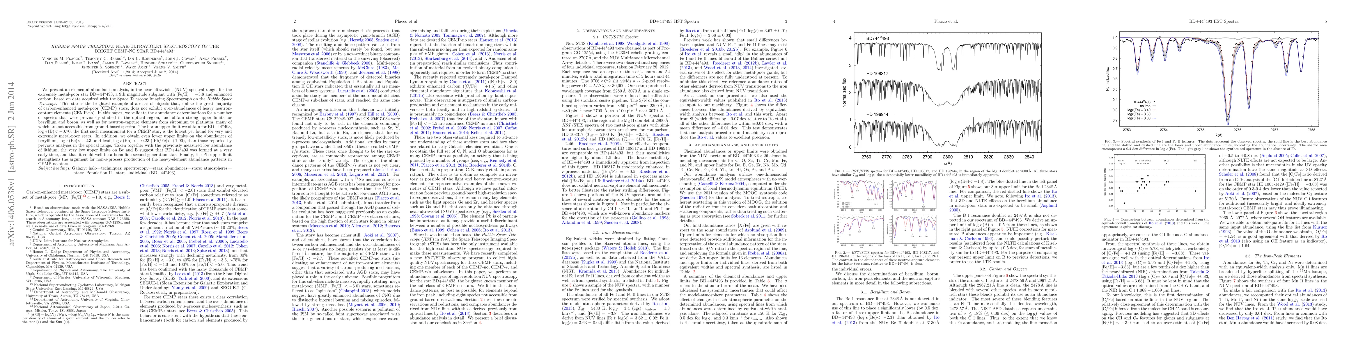 We present an elemental-abundance analysis, in the near-ultraviolet (NUV) spectral range, for the extremely metal-poor star BD+44 493, a 9th magnitude sub-giant with [Fe/H] = -3.8 and enhanced carbon, based on data acquired with the Space Telescope Imaging Spectrograph on the Hubble Space Telescope. This star is the brightest example of a class of objects that, unlike the great majority of carbon-enhanced metal-poor (CEMP) stars, does not exhibit over-abundances of heavy neutron-capture elements (CEMP-no). In this paper, we validate the abundance determinations for a number of species that were previously studied in the optical region, and obtain strong upper limits for beryllium and boron, as well as for neutron-capture elements from zirconium to platinum, many of which are not accessible from ground-based spectra. The boron upper limit we obtain for BD+44 493, logeps(B) < -0.70, the first such measurement for a CEMP star, is the lowest yet found for very and extremely metal-poor stars. In addition, we obtain even lower upper limits on the abundances of beryllium, logeps(Be) < -2.3, and lead, logeps(Pb) < -0.23 ([Pb/Fe] < +1.90), than those reported by previous analyses in the optical range. Taken together with the previously measured low abundance of lithium, the very low upper limits on Be and B suggest that BD+44 493 was formed at a very early time, and that it could well be a bona-fide second-generation star. Finally, the Pb upper limit strengthens the argument for non-s-process production of the heavy-element abundance patterns in CEMP-no stars.