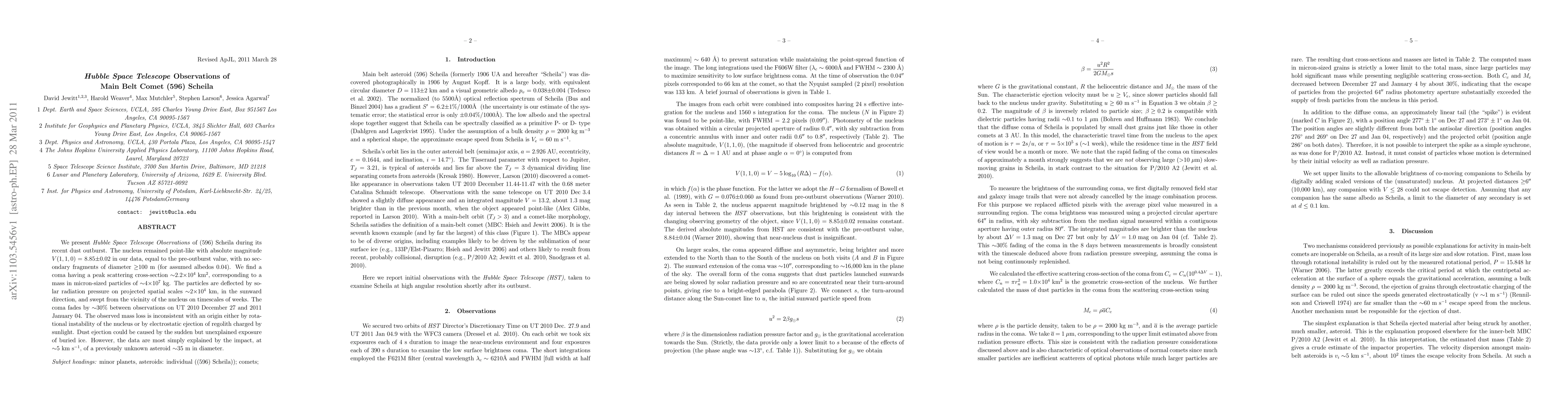 We present Hubble Space Telescope Observations of (596) Scheila during its recent dust outburst. The nucleus remained point-like with absolute magnitude V(1,1,0) = 8.85+/-0.02 in our data, equal to the pre-outburst value, with no secondary fragments of diameter =>100 m (for assumed albedos 0.04). We find a coma having a peak scattering cross-section ~2.2x10^4 km^2 corresponding to a mass in micron-sized particles of ~4x10^7 kg. The particles are deflected by solar radiation pressure on projected spatial scales ~2x10^4 km, in the sunward direction, and swept from the vicinity of the nucleus on timescales of weeks. The coma fades by ~30% between observations on UT 2010 December 27 and 2011 January 04. The observed mass loss is inconsistent with an origin either by rotational instability of the nucleus or by electrostatic ejection of regolith charged by sunlight. Dust ejection could be caused by the sudden but unexplained exposure of buried ice. However, the data are most simply explained by the impact, at ~5 km/s of a previously unknown asteroid ~35 m in diameter.