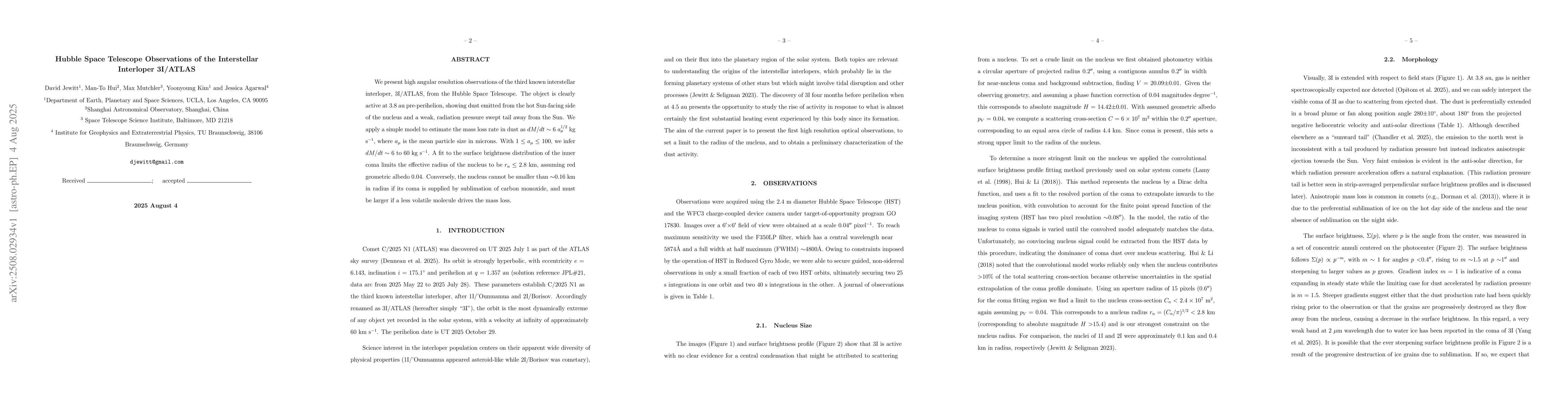 We present high angular resolution observations of the third known interstellar interloper, 3I/ATLAS, from the Hubble Space Telescope. The object is clearly active at 3.8 au pre-perihelion, showing dust emitted from the hot Sun-facing side of the nucleus and a weak, radiation pressure swept tail away from the Sun. We apply a simple model to estimate the mass loss rate in dust as dM/dt = 6 a kg/s, where a is the mean particle size in microns. With 1 < a < 100, we infer dM/dt = 6 to 60 kg/s. A fit to the surface brightness distribution of the inner coma limits the effective radius of the nucleus to be r < 2.8 km, assuming red geometric albedo 0.04. Conversely, the nucleus cannot be smaller than 0.16 km in radius if its coma is supplied by sublimation of carbon monoxide, and must be larger if a less volatile molecule drives the mass loss.