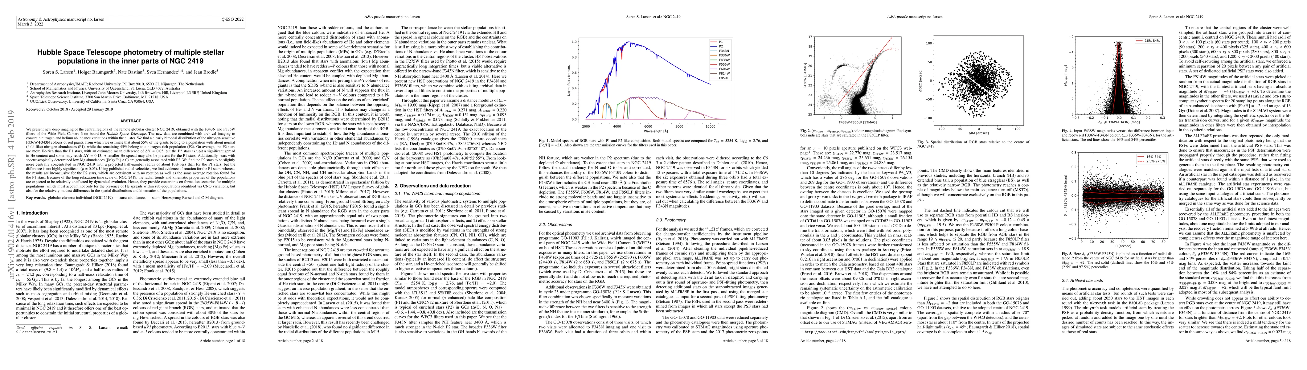 We present new deep imaging of the central regions of the remote globular cluster NGC 2419, obtained with the F343N and F336W filters of HST/WFC3. The new data are combined with archival imaging to constrain nitrogen and helium abundance variations within the cluster. We find a clearly bimodal distribution of the nitrogen-sensitive F336W-F343N colours of red giants, from which we estimate that about 55% of the giants belong to a population with about normal (field-like) nitrogen abundances (P1), while the remaining 45% belong to a nitrogen-rich population (P2). On average, the P2 stars are more He-rich than the P1 stars, with an estimated mean difference of Delta Y = 0.05, but the P2 stars exhibit a significant spread in He content and some may reach Delta Y = 0.13. A smaller He spread may be present also for the P1 stars. Additionally, stars with spectroscopically determined low [Mg/Fe] ratios ([Mg/Fe]<0) are generally associated with P2. We find the P2 stars to be slightly more centrally concentrated in NGC 2419 with a projected half-number radius of about 10% less than for the P1 stars, but the difference is not highly significant (p=0.05). We find evidence of rotation for the P1 stars, whereas the results are inconclusive for the P2 stars, which are consistent with no rotation as well as the same average rotation found for the P1 stars. Because of the long relaxation time scale of NGC 2419, the radial trends and kinematic properties of the populations are expected to be relatively unaffected by dynamical evolution. Hence, they provide constraints on formation scenarios for multiple populations, which must account not only for the presence of He spreads within sub-populations identified via CNO variations, but also for the relatively modest differences in the spatial distributions and kinematics of the populations.