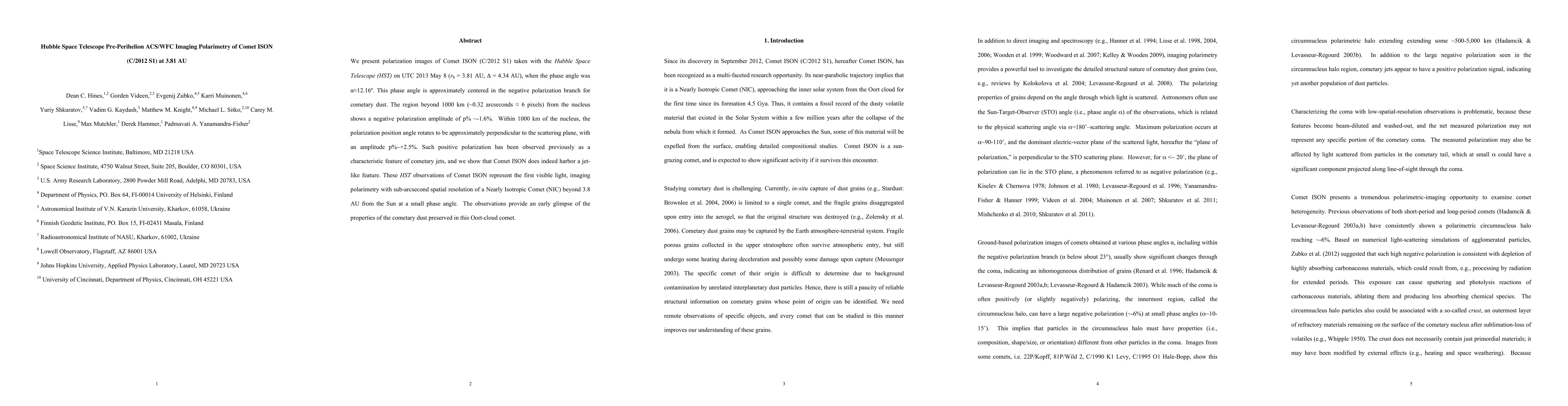 We present polarization images of Comet ISON (C/2012 S1) taken with the Hubble Space Telescope (HST) on UTC 2013 May 8 (rh = 3.81 AU, Delta = 4.34 AU), when the phase angle was alpha = 12.16 degrees. This phase angle is approximately centered in the negative polarization branch for cometary dust. The region beyond 1000 km from the nucleus shows a negative polarization amplitude of p% -1.6%. Within 1000 km of the nucleus, the polarization position angle rotates to be approximately perpendicular to the scattering plane, with an amplitude p% +2.5%. Such positive polarization has been observed previously as a characteristic feature of cometary jets, and we show that Comet ISON does indeed harbor a jet-like feature. These HST observations of Comet ISON represent the first visible light, imaging polarimetry with sub-arcsecond spatial resolution of a Nearly Isotropic Comet (NIC) beyond 3.8 AU from the Sun at a small phase angle. The observations provide an early glimpse of the properties of the cometary dust preserved in this Oort-cloud comet.