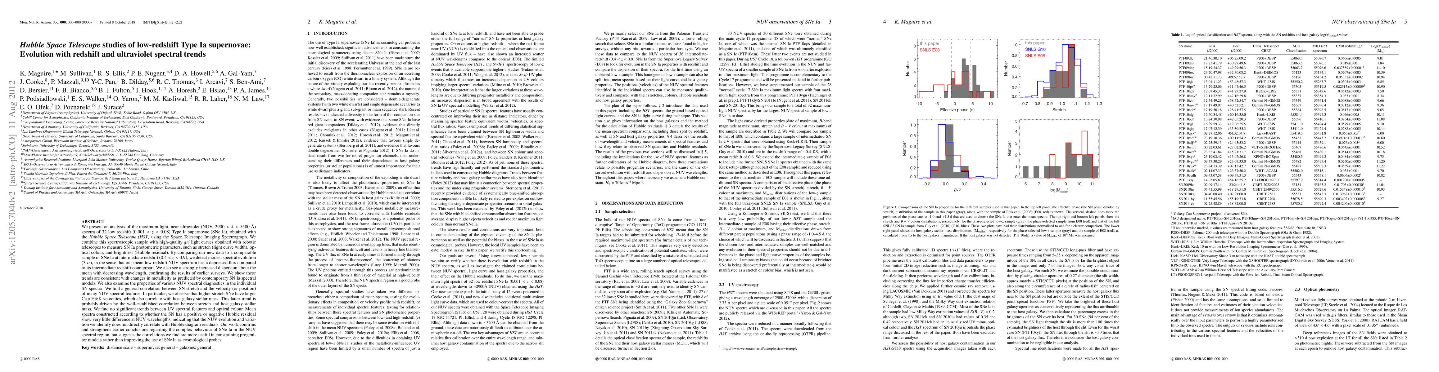 This study analyzes the near ultraviolet (NUV) spectra of 32 low-redshift Type Ia supernovae (SNe Ia) using the Hubble Space Telescope, revealing modest spectral evolution and increased dispersion in NUV flux compared to intermediate-z SNe Ia. The findings suggest these trends are linked to metallicity changes, with higher stretch SNe showing larger Ca II H&K velocities correlating with host galaxy stellar mass.