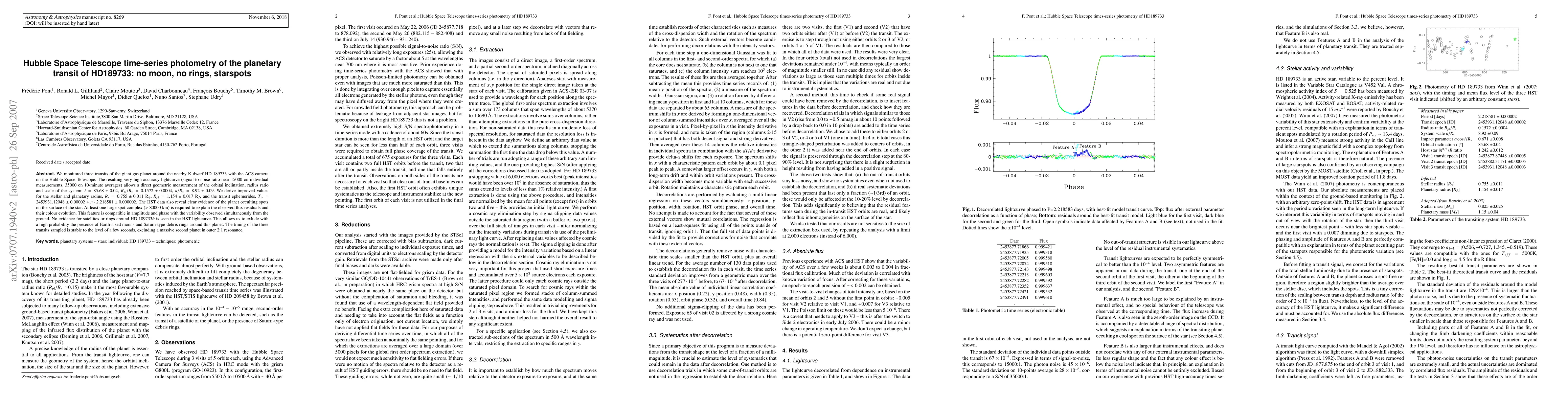 We monitored three transits of the giant gas planet around the nearby K dwarf HD 189733 with the ACS camera on the Hubble Space Telescope. The resulting very-high accuracy lightcurve (signal-to-noise ratio near 15000 on individual measurements, 35000 on 10-minute averages) allows a direct geometric measurement of the orbital inclination, radius ratio and scale of the system: i = 85.68 +- 0.04, Rpl/R*=0.1572 +- 0.0004, a/R*=8.92 +- 0.09. We derive improved values for the stellar and planetary radius, R*=0.755+- 0.011 Rsol, Rpl=1.154 +- 0.017 RJ, and the transit ephemerides, Ttr=2453931.12048 +- 0.00002 + n 2.218581 +- 0.000002$. The HST data also reveal clear evidence of the planet occulting spots on the surface of the star. At least one large spot complex (>80000 km) is required to explain the observed flux residuals and their colour evolution. This feature is compatible in amplitude and phase with the variability observed simultaneously from the ground. No evidence for satellites or rings around HD 189733b is seen in the HST lightcurve. This allows us to exlude with a high probability the presence of Earth-sized moons and Saturn-type debris rings around this planet. The timing of the three transits sampled is stable to the level of a few seconds, excluding a massive second planet in outer 2:1 resonance.