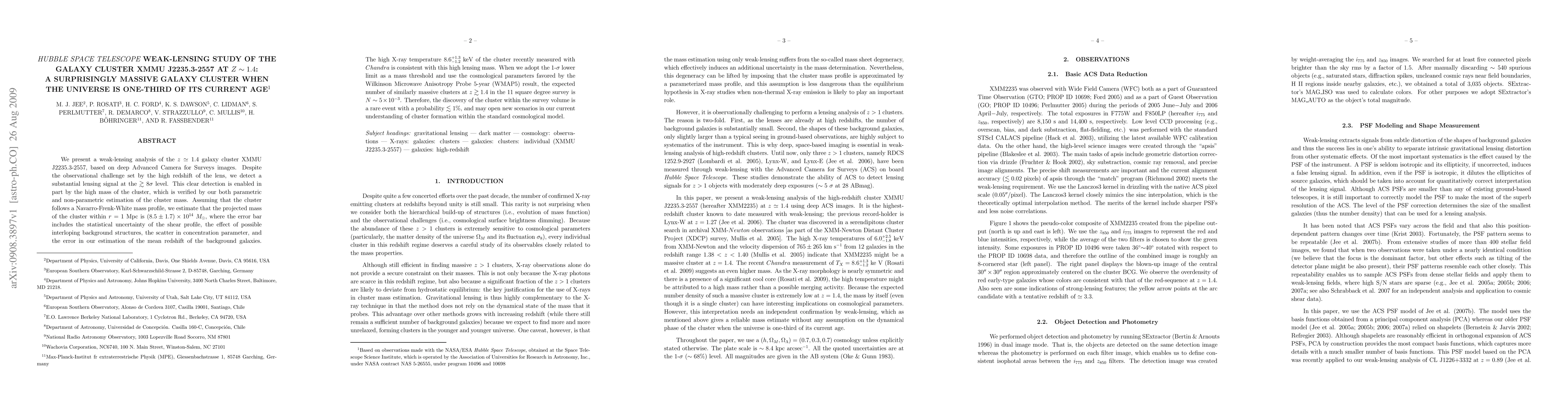 We present a weak-lensing analysis of the z=1.4 galaxy cluster XMMU J2235.3-2557, based on deep Advanced Camera for Surveys images. Despite the observational challenge set by the high redshift of the lens, we detect a substantial lensing signal at the >~ 8 sigma level. This clear detection is enabled in part by the high mass of the cluster, which is verified by our both parametric and non-parametric estimation of the cluster mass. Assuming that the cluster follows a Navarro-Frenk-White mass profile, we estimate that the projected mass of the cluster within r=1 Mpc is (8.5+-1.7) x 10^14 solar mass, where the error bar includes the statistical uncertainty of the shear profile, the effect of possible interloping background structures, the scatter in concentration parameter, and the error in our estimation of the mean redshift of the background galaxies. The high X-ray temperature 8.6_{-1.2}^{+1.3} keV of the cluster recently measured with Chandra is consistent with this high lensing mass. When we adopt the 1-sigma lower limit as a mass threshold and use the cosmological parameters favored by the Wilkinson Microwave Anisotropy Probe 5-year (WMAP5) result, the expected number of similarly massive clusters at z >~ 1.4 in the 11 square degree survey is N ~ 0.005. Therefore, the discovery of the cluster within the survey volume is a rare event with a probability < 1%, and may open new scenarios in our current understanding of cluster formation within the standard cosmological model.