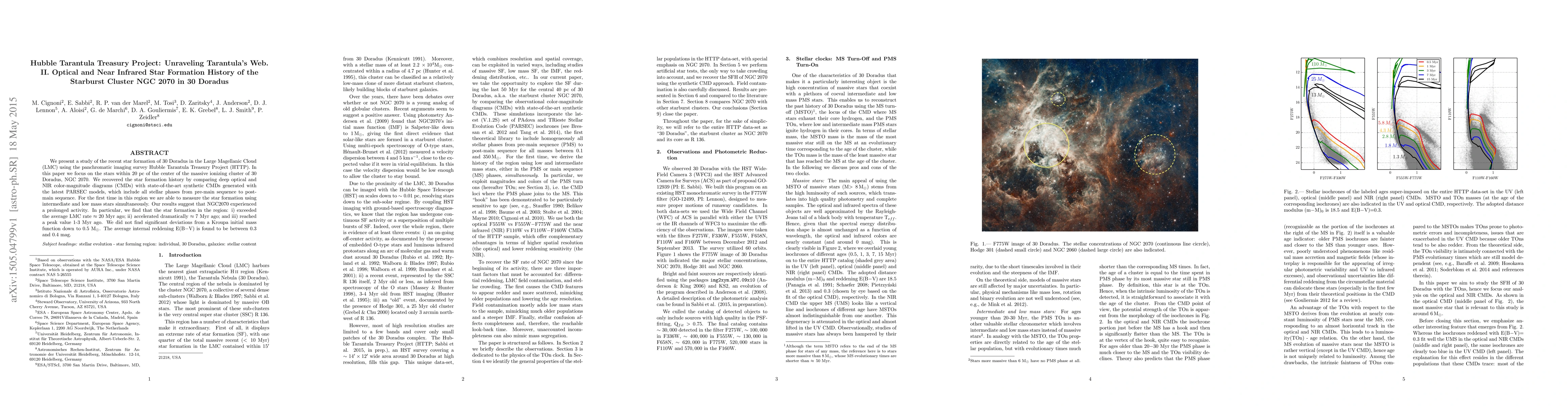 This study uses the Hubble Tarantula Treasury Project to analyze the star formation history of NGC 2070 in 30 Doradus, revealing a prolonged star formation activity peaking 1-3 Myr ago. The research combines deep optical and NIR color-magnitude diagrams with PARSEC models, showing no significant deviations from a Kroupa initial mass function.