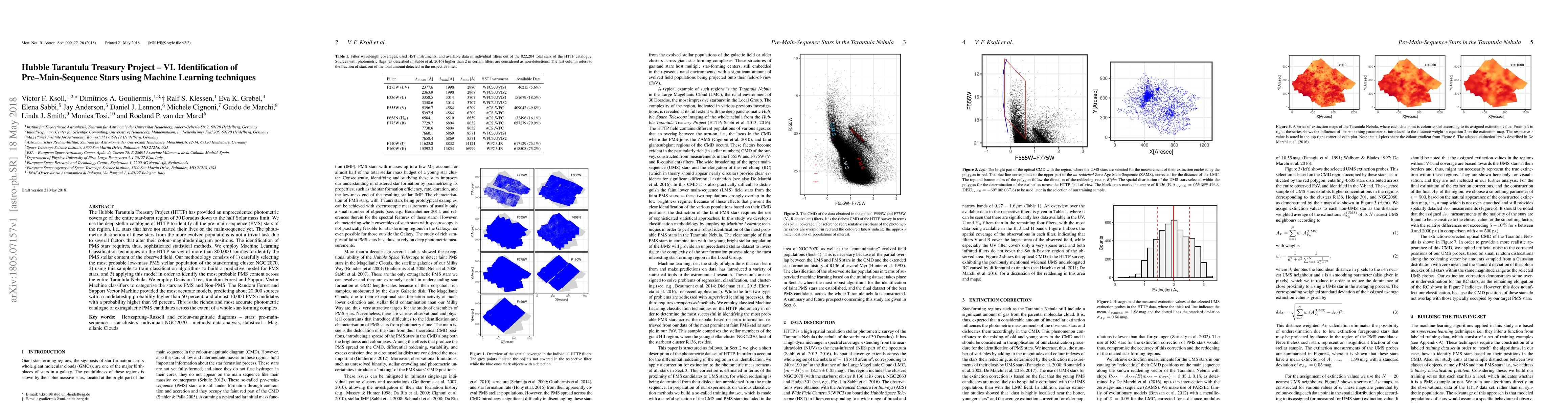 The Hubble Tarantula Treasury Project uses machine learning to identify pre-main-sequence stars in the 30 Doradus region, employing Random Forest and Support Vector Machine classifiers to accurately categorize over 20,000 probable PMS stars. This method yields the most comprehensive catalogue of extragalactic PMS candidates to date.