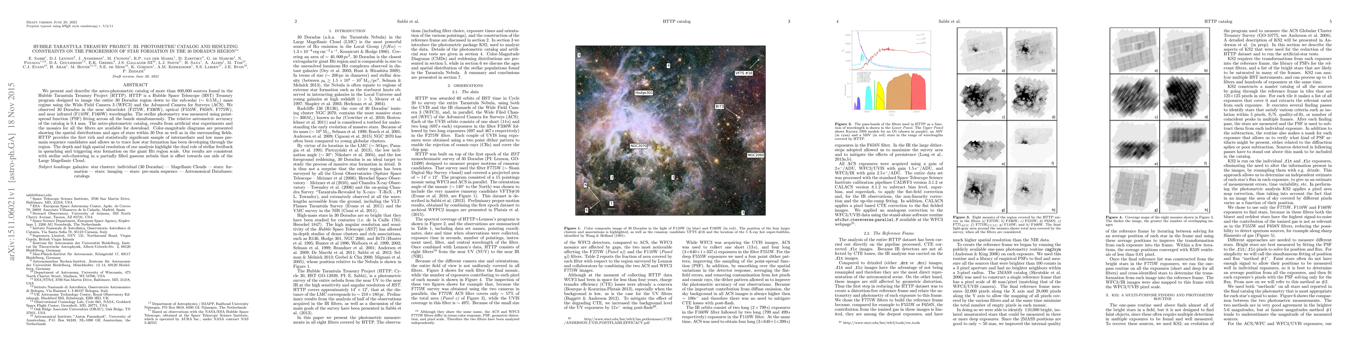 The Hubble Tarantula Treasury Project (HTTP) catalogs over 800,000 sources in the 30 Doradus region, providing detailed photometric data across multiple wavelengths. The study reveals the spatial distribution and ages of stars, highlighting the dual role of stellar feedback in star formation and supporting the presence of stellar sub-clustering within a partially filled gaseous nebula.