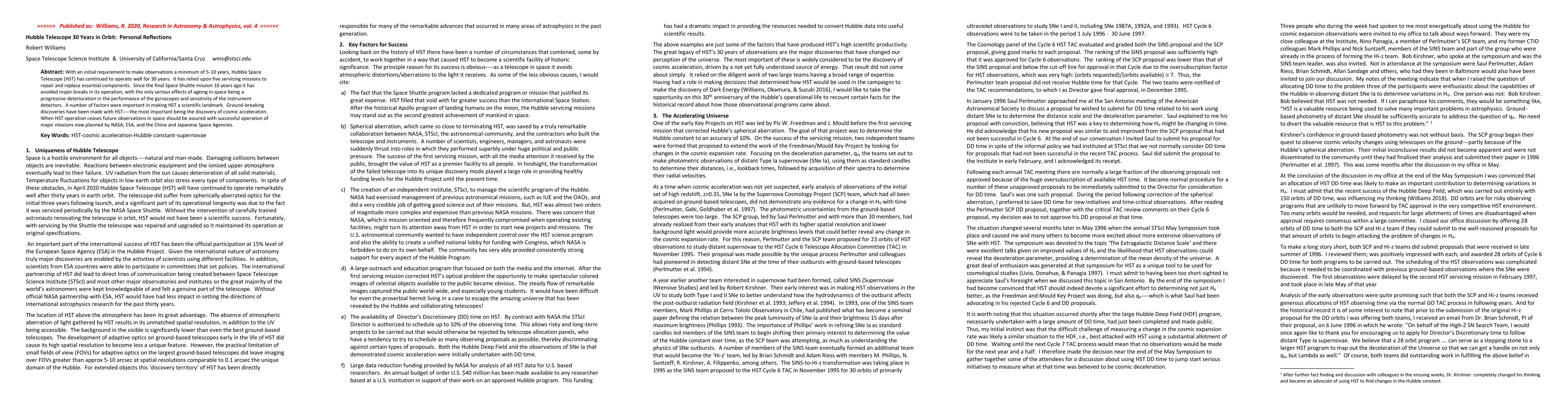 With an initial requirement to make observations a minimum of 5-10 years, Hubble Space Telescope (HST) has continued to operate well for 30 years. It has relied upon five servicing missions to repair and replace essential components. Since the final Space Shuttle mission 10 years ago it has avoided major breaks in its operation, with the only serious effects of ageing in space being a progressive deterioration in the performance of the gyroscopes and sensitivity of the instrument detectors. A number of factors were important in making HST a scientific landmark. Ground-breaking discoveries have been made with HST----the most important being the discovery of cosmic acceleration. When HST operation ceases future observations in space should be assured with successful operation of major missions now planned by NASA, ESA, and the China and Japanese Space Agencies.