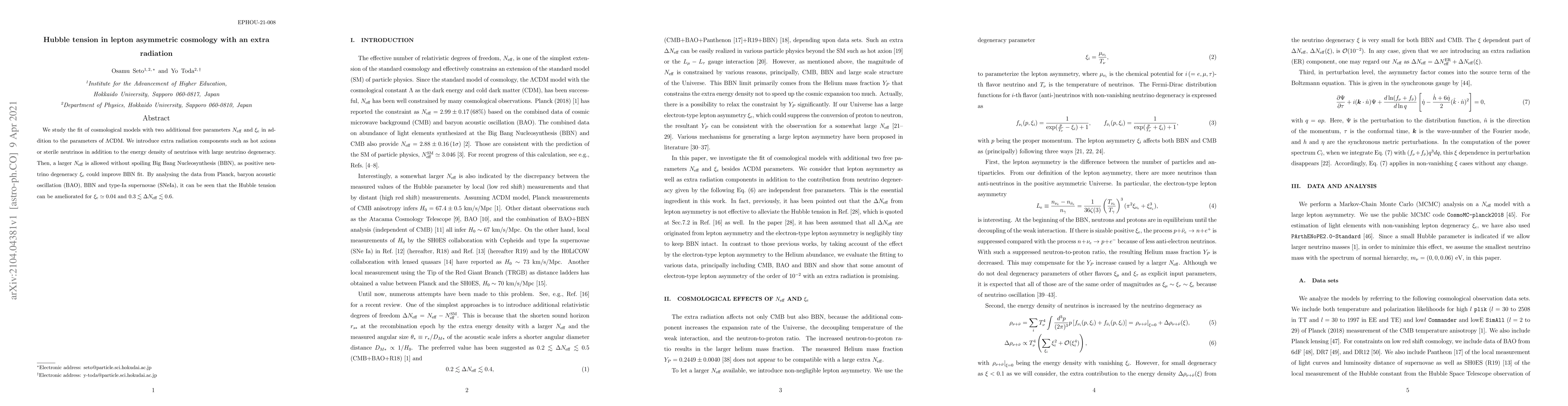 We study the fit of cosmological models with two additional free parameters $N_\mathrm{eff}$ and $\xi_e$ in addition to the parameters of $\Lambda$CDM. We introduce extra radiation components such as hot axions or sterile neutrinos in addition to the energy density of neutrinos with large neutrino degeneracy. Then, a larger $N_\mathrm{eff}$ is allowed without spoiling Big Bang Nucleosynthesis (BBN), as positive neutrino degeneracy $\xi_e$ could improve BBN fit. By analysing the data from Planck, baryon acoustic oscillation (BAO), BBN and type-Ia supernovae (SNeIa), it can be seen that the Hubble tension can be ameliorated for $\xi_{e}\simeq 0.04$ and $0.3 \lesssim \Delta N_\mathrm{eff} \lesssim 0.6$.