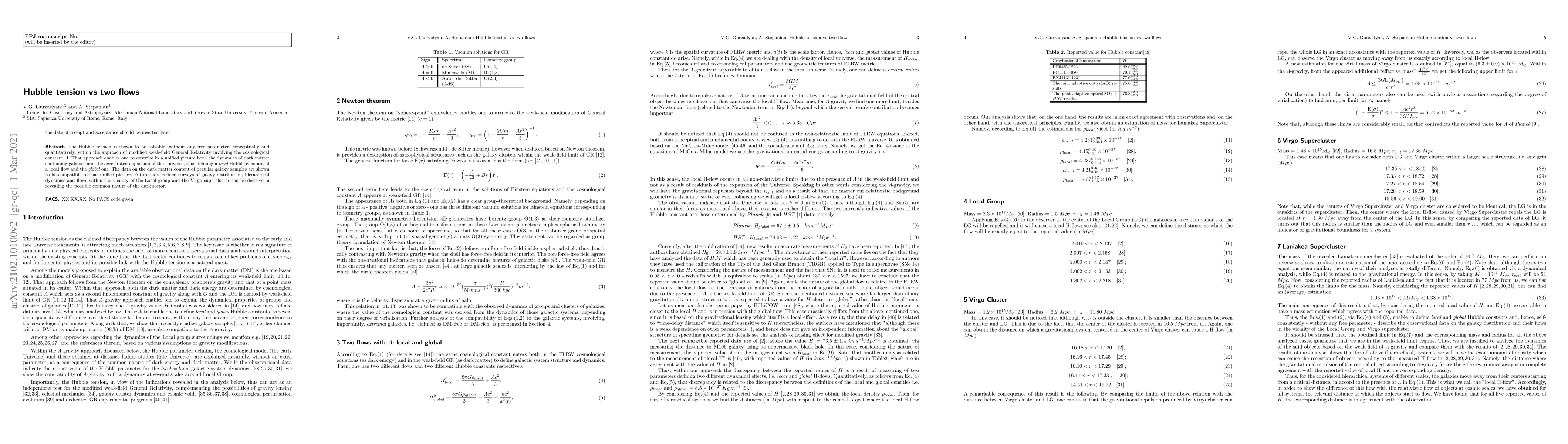 The Hubble tension is shown to be solvable, without any free parameter, conceptually and quantitatively, within the approach of modified weak-field General Relativity involving the cosmological constant $\Lambda$. That approach enables one to describe in a unified picture both the dynamics of dark matter containing galaxies and the accelerated expansion of the Universe, thus defining a {\it local} Hubble constant of a local flow and the {\it global} one. The data on the dark matter content of peculiar galaxy samples are shown to be compatible to that unified picture. Future more refined surveys of galaxy distribution, hierarchical dynamics and flows within the vicinity of the Local group and the Virgo supercluster can be decisive in revealing the possible common nature of the dark sector.