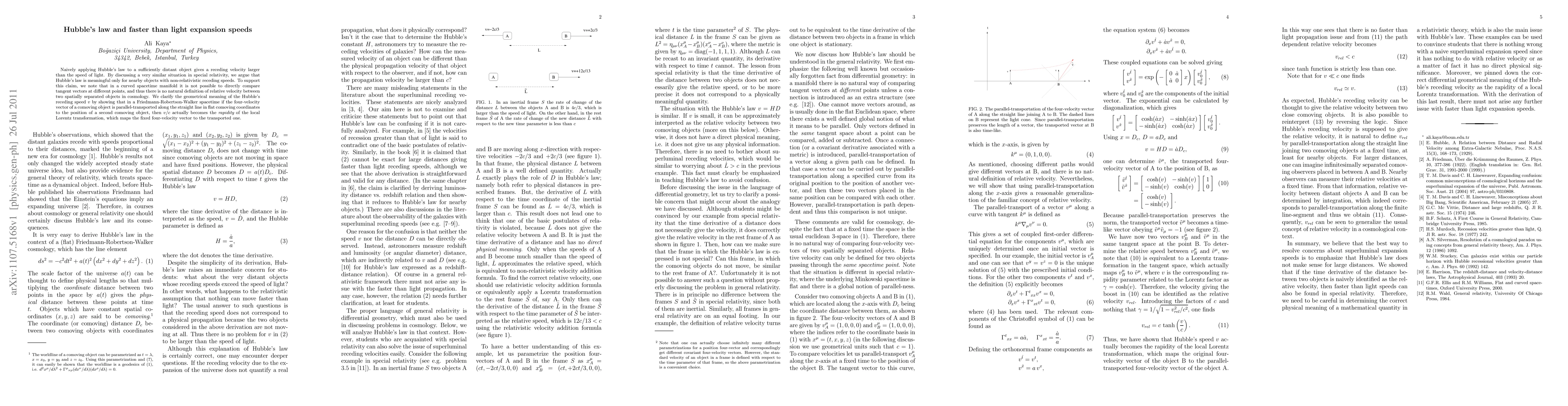 This paper argues that Hubble's law applies meaningfully only to nearby objects with non-relativistic speeds, as applying it to distant objects results in velocities exceeding the speed of light. It clarifies that in a curved spacetime, there is no direct comparison of tangent vectors, thus no natural definition of relative velocity between distant objects.