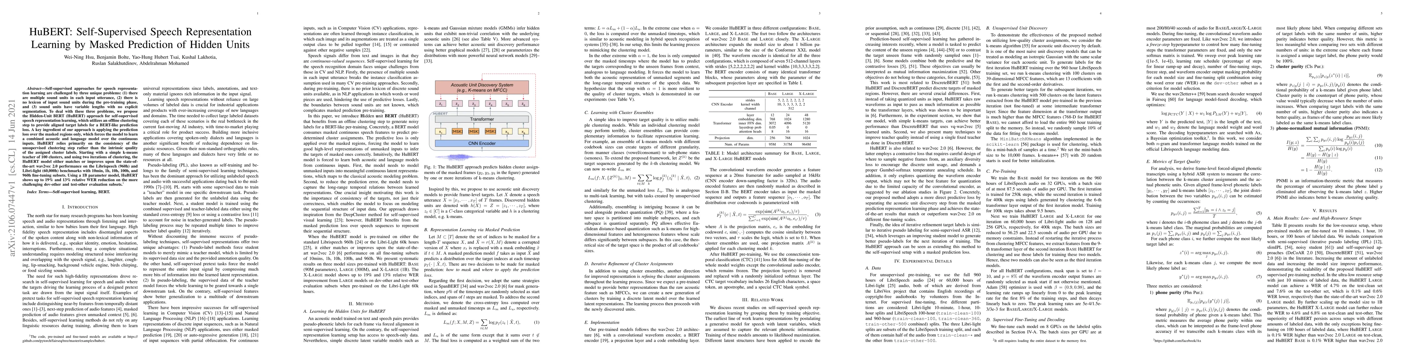 HuBERT introduces a self-supervised learning method for speech representation by masking and predicting hidden units, addressing challenges of multiple sound units, lack of lexicon, and variable lengths. It outperforms wav2vec 2.0 on Librispeech and Libri-light benchmarks, achieving significant reductions in Word Error Rates.