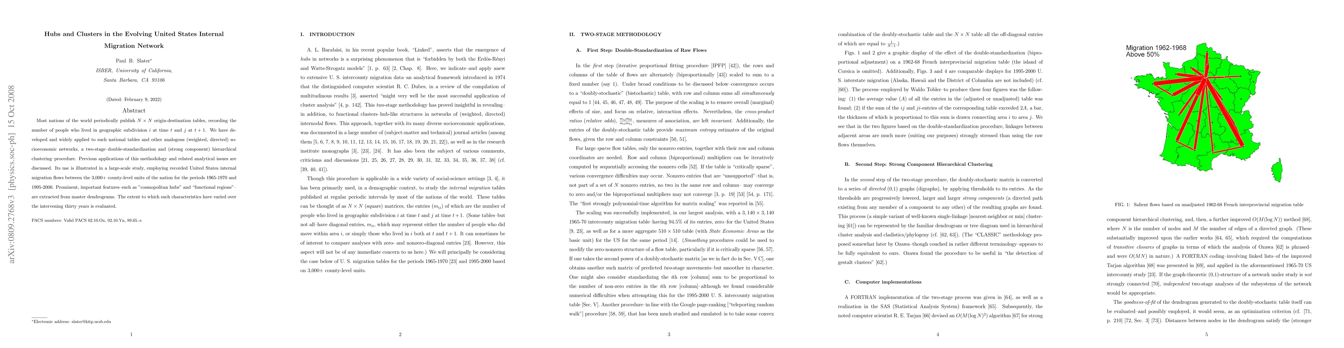 This paper develops a two-stage methodology for analyzing U.S. internal migration networks, identifying "cosmopolitan hubs" and "functional regions" from county-level migration data. It evaluates changes in these features over the periods 1965-1970 and 1995-2000.