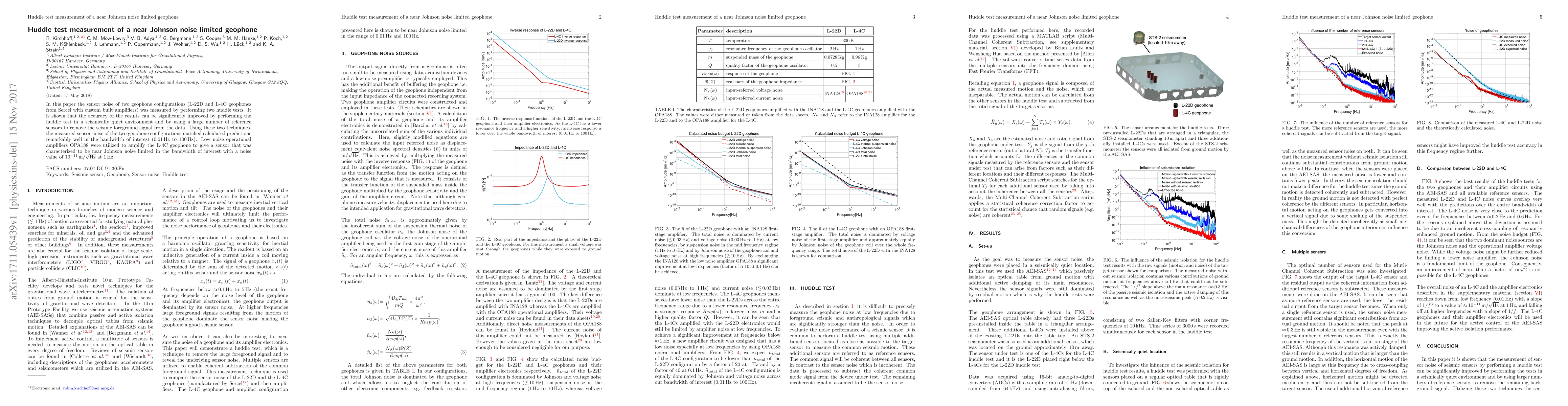 This paper measures the sensor noise of two geophone configurations using huddle tests, showing improved accuracy in seismically quiet environments and with numerous reference sensors. The L-4C geophone, amplified with low noise OPA188 operational amplifiers, achieves near Johnson noise limited performance with a noise value of $10^{-11} \text{m}/\sqrt{\text{Hz}}$ at 1 Hz in the 0.01 Hz to 100 Hz bandwidth.