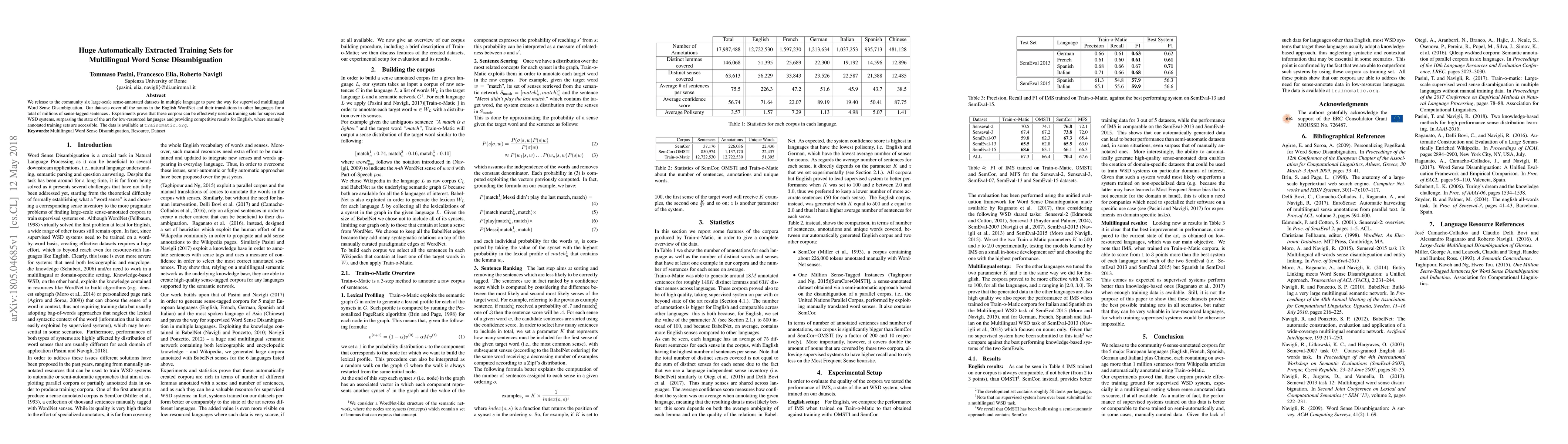This paper releases six large-scale, sense-annotated multilingual datasets to advance supervised Word Sense Disambiguation, covering all English WordNet nouns and their translations. Experiments show these datasets outperform state-of-the-art for low-resource languages and compete for English.