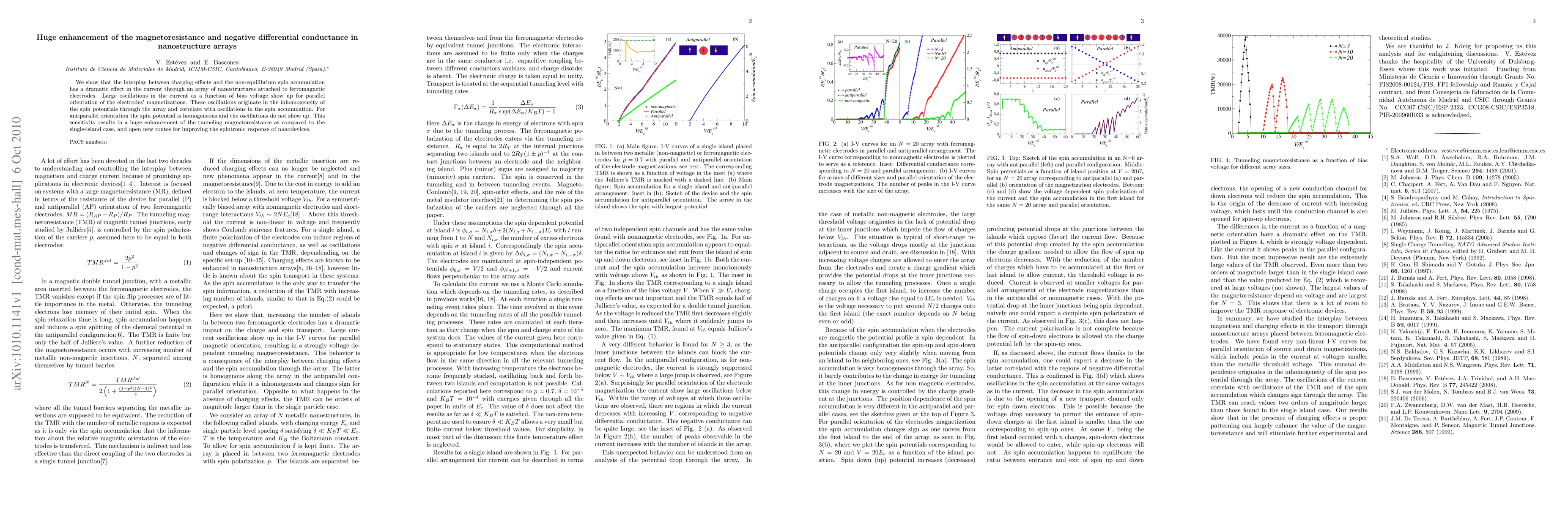 We show that the interplay between charging effects and the non-equilibrium spin accumulation has a dramatic effect in the current through an array of nanostructures attached to ferromagnetic electrodes. Large oscillations in the current as a function of bias voltage show up for parallel orientation of the electrodes' magnetizations. These oscillations originate in the inhomogeneity of the spin potentials through the array and correlate with oscillations in the spin accumulation. For antiparallel orientation the spin potential is homogeneous and the oscillations do not show up.This sensitivity results in a huge enhancement of the tunneling magnetoresistance as compared to the single-island case, and open new routes for improving the spintronic response of nanodevices.