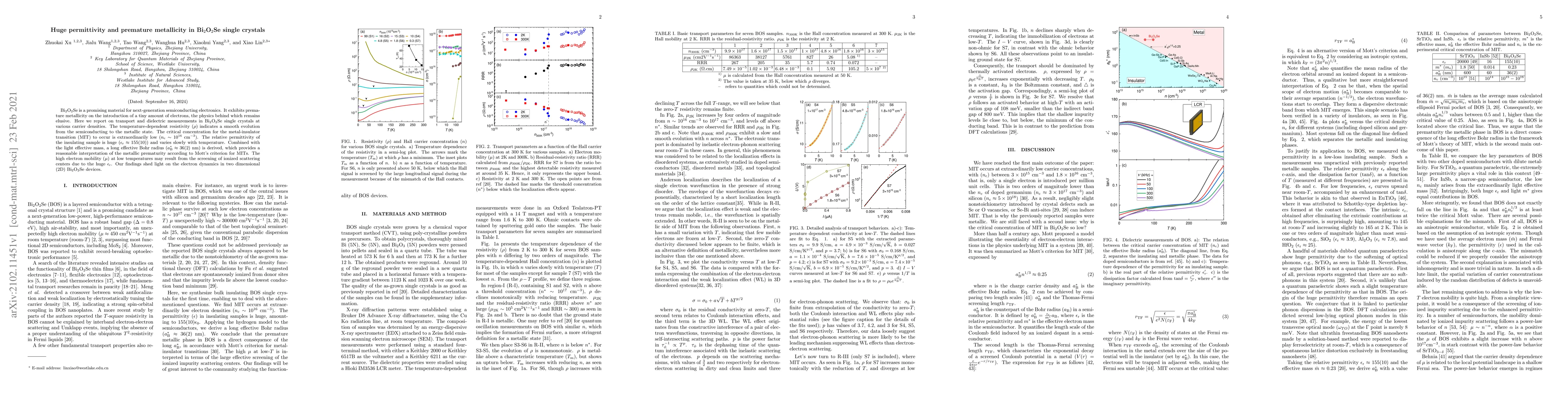 This paper investigates the transport and dielectric properties of Bi$_2$O$_2$Se single crystals, revealing a low critical concentration for the metal-insulator transition and a high relative permittivity. The findings suggest that the material's unique electron dynamics, including its premature metallicity, can be explained by its large effective Bohr radius and high electron mobility.