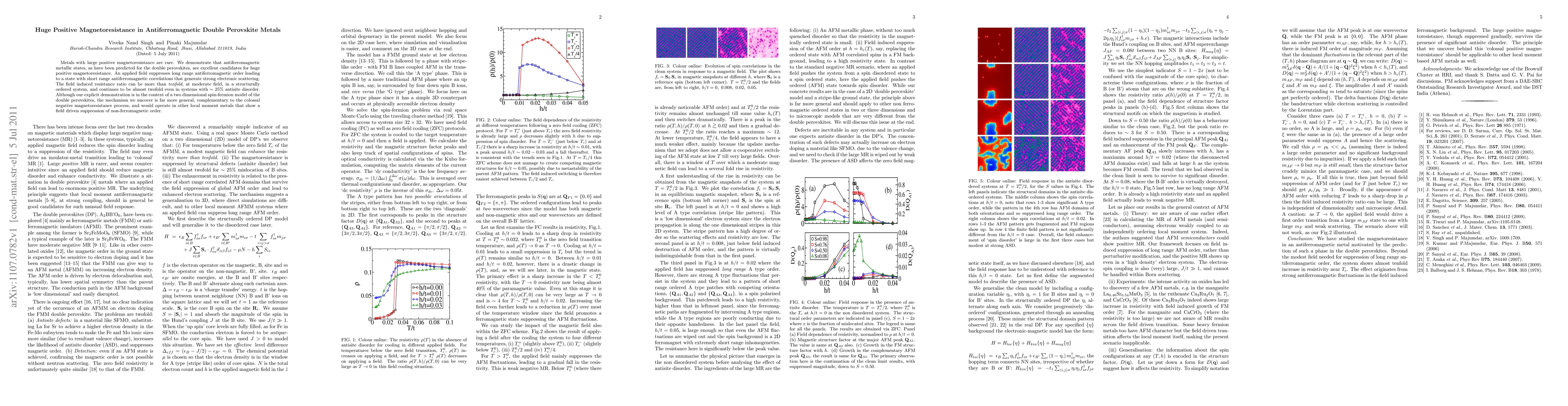 Metals with large positive magnetoresistance are rare. We demonstrate that antiferromagnetic metallic states, as have been predicted for the double perovskites, are excellent candidates for huge positive magnetoresistance. An applied field suppresses long range antiferromagnetic order leading to a state with short range antiferromagnetic correlations that generate strong electronic scattering. The field induced resistance ratio can be more than tenfold, at moderate field, in a structurally ordered system, and continues to be almost twofold even in systems with upto 25 % antisite disorder. Although our explicit demonstration is in the context of a two dimensional spin-fermion model of the double perovskites, the mechanism we uncover is far more general, complementary to the colossal negative magnetoresistance process, and would operate in other local moment metals that show a field driven suppression of non-ferromagnetic order.