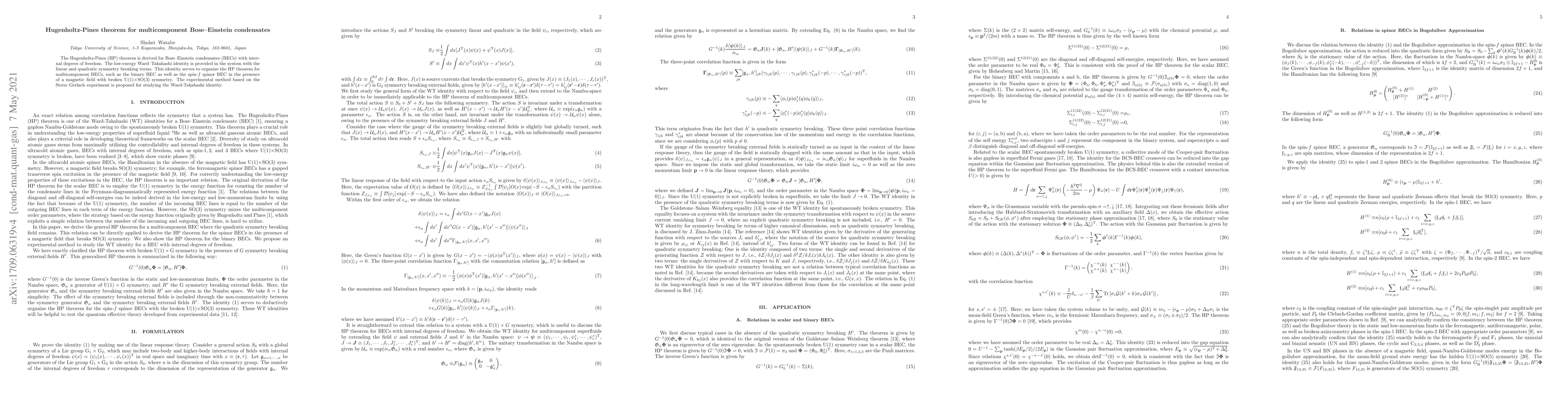 The Hugenholtz-Pines theorem is extended to multicomponent Bose-Einstein condensates, providing a low-energy Ward-Takahashi identity that organizes the theorem for systems like binary and spinor BECs with broken symmetries. An experimental method based on the Stern-Gerlach experiment is proposed to study this identity.
