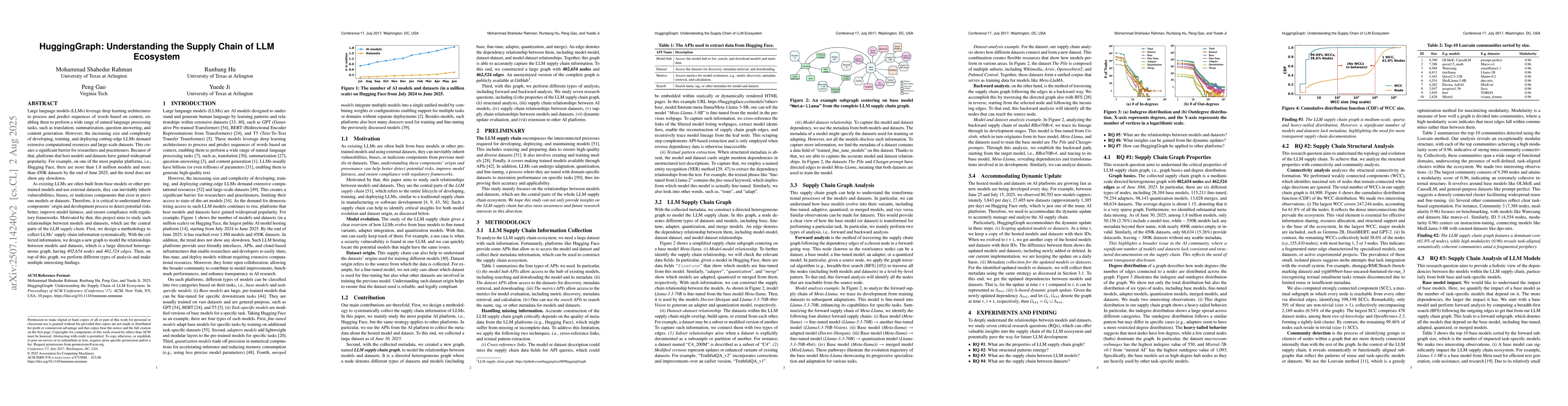 HuggingGraph, a method to analyze the supply chain of the LLM ecosystem, provides a directed heterogeneous graph modeling relationships between models and datasets.