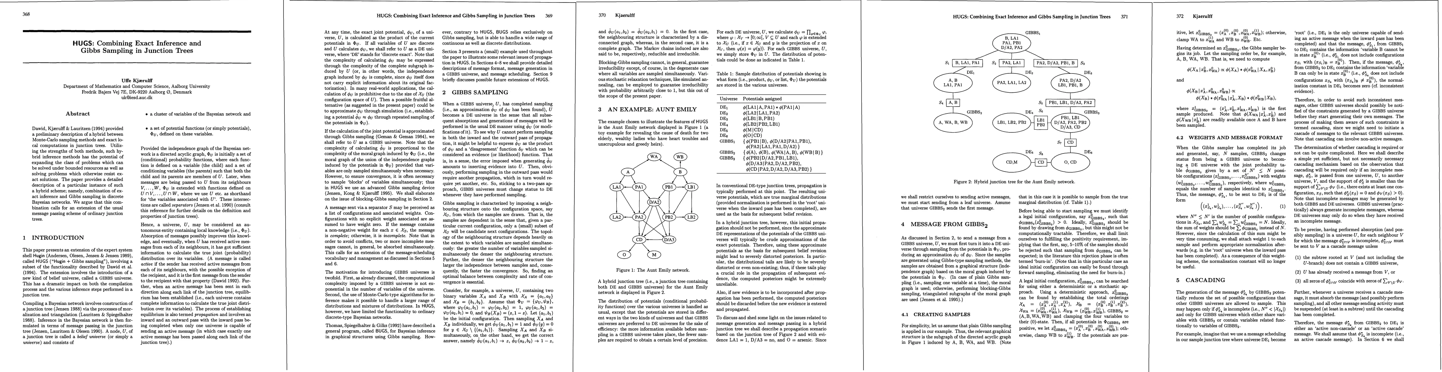 This paper introduces HUGS, a hybrid method combining exact inference and Gibbs sampling in junction trees for discrete Bayesian networks, aiming to solve problems that resist exact solutions while utilizing bounded resources. The method extends the standard message passing scheme to integrate these two inference techniques effectively.