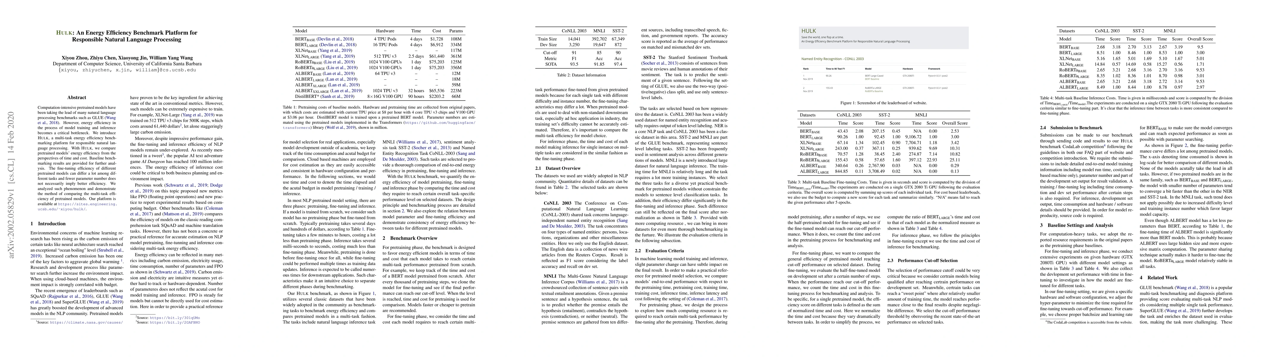 HULK is a benchmarking platform designed to evaluate the energy efficiency of pretrained natural language processing models, focusing on both training and inference processes. It provides comparative results to help identify the most efficient models across various tasks, highlighting that fewer parameters do not always equate to better efficiency.