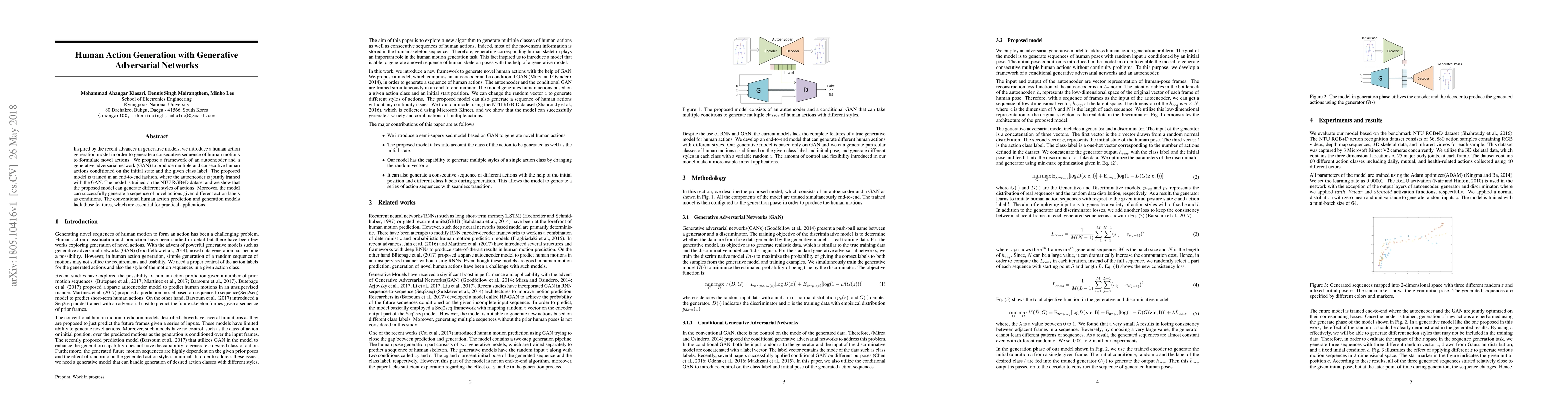 This paper proposes a generative model combining an autoencoder and a GAN to generate sequences of human actions conditioned on initial state and action labels. The model is trained end-to-end on the NTU RGB+D dataset and demonstrates the ability to produce novel action sequences and different action styles.