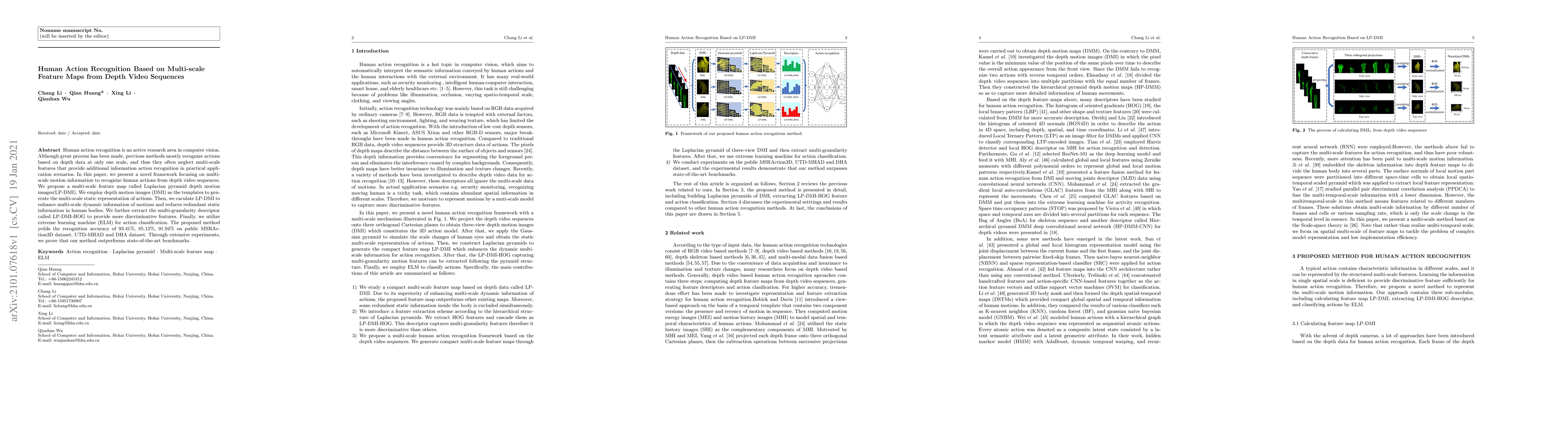 This paper introduces a novel framework for human action recognition using multi-scale feature maps derived from depth video sequences. It employs Laplacian pyramid depth motion images (LP-DMI) to capture multi-scale dynamic information and uses an extreme learning machine for classification, achieving high recognition accuracy on multiple datasets.