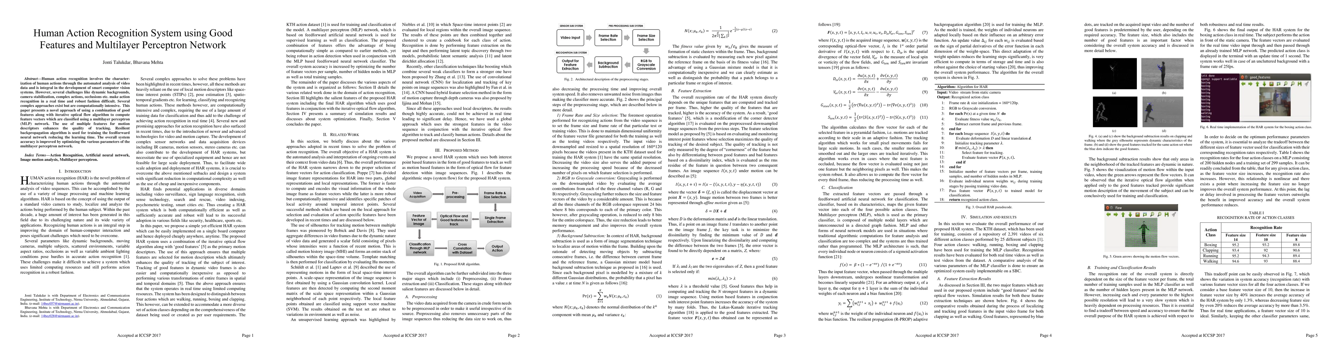 This paper proposes a human action recognition system using good features and a multilayer perceptron network, addressing challenges like dynamic backgrounds and occlusions. It employs a combination of features and an iterative optical flow algorithm, trained with a resilient backpropagation algorithm to enhance accuracy and reduce learning time.
