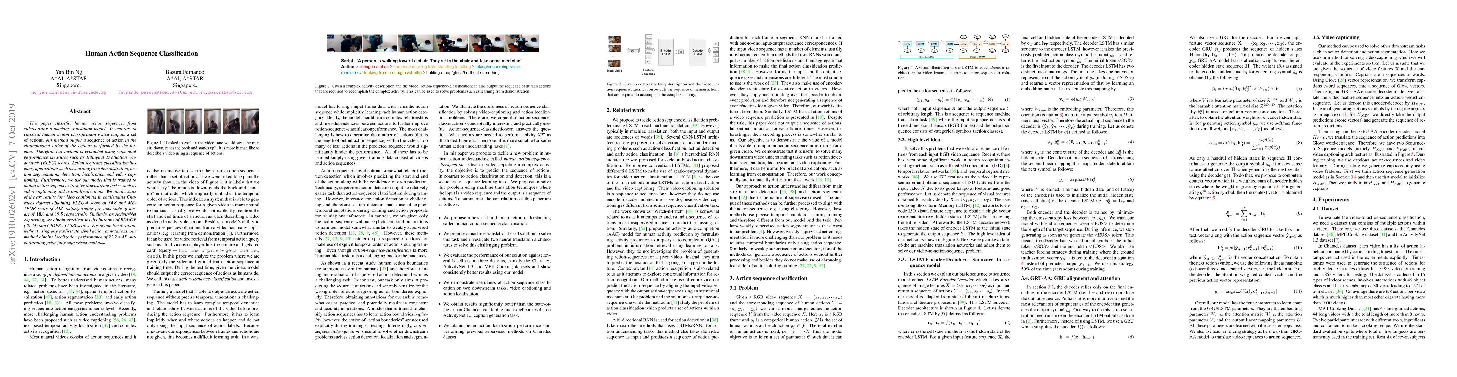This paper proposes a machine translation model for classifying human action sequences from videos, achieving state-of-the-art results in video captioning and action localization tasks with high BLEU and ROUGE scores.