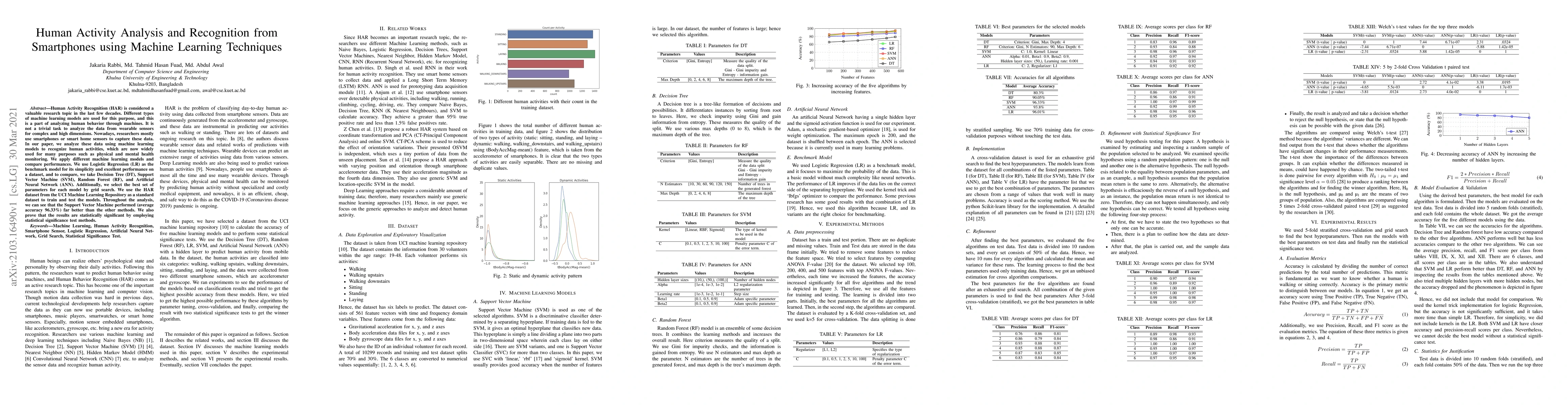 Human Activity Recognition (HAR) is considered a valuable research topic in the last few decades. Different types of machine learning models are used for this purpose, and this is a part of analyzing human behavior through machines. It is not a trivial task to analyze the data from wearable sensors for complex and high dimensions. Nowadays, researchers mostly use smartphones or smart home sensors to capture these data. In our paper, we analyze these data using machine learning models to recognize human activities, which are now widely used for many purposes such as physical and mental health monitoring. We apply different machine learning models and compare performances. We use Logistic Regression (LR) as the benchmark model for its simplicity and excellent performance on a dataset, and to compare, we take Decision Tree (DT), Support Vector Machine (SVM), Random Forest (RF), and Artificial Neural Network (ANN). Additionally, we select the best set of parameters for each model by grid search. We use the HAR dataset from the UCI Machine Learning Repository as a standard dataset to train and test the models. Throughout the analysis, we can see that the Support Vector Machine performed (average accuracy 96.33%) far better than the other methods. We also prove that the results are statistically significant by employing statistical significance test methods.