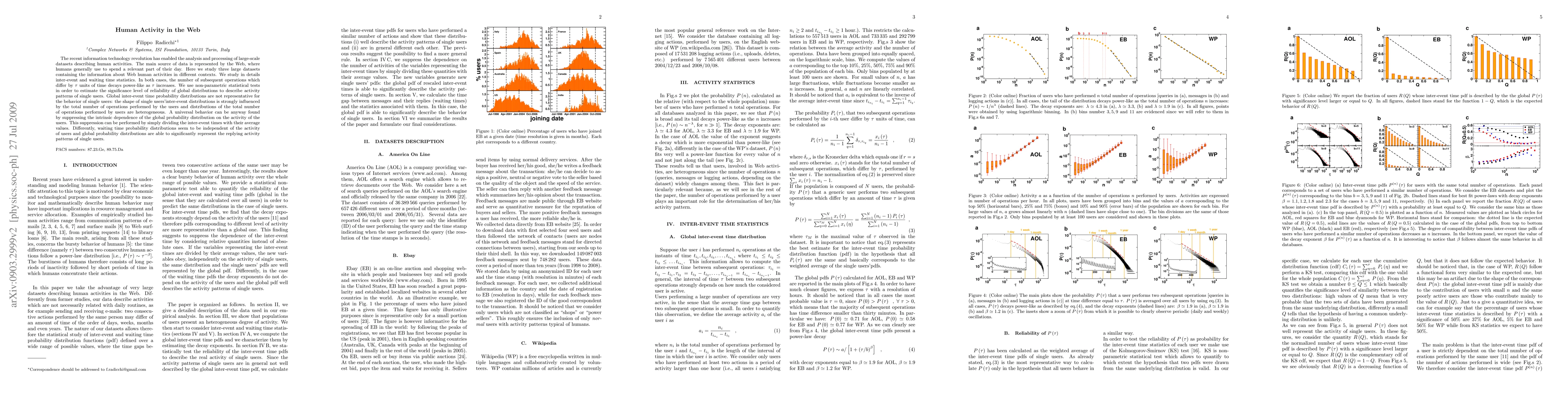 The recent information technology revolution has enabled the analysis and processing of large-scale datasets describing human activities. The main source of data is represented by the Web, where humans generally use to spend a relevant part of their day. Here we study three large datasets containing the information about Web human activities in different contexts. We study in details inter-event and waiting time statistics. In both cases, the number of subsequent operations which differ by tau units of time decays power-like as tau increases. We use non-parametric statistical tests in order to estimate the significance level of reliability of global distributions to describe activity patterns of single users. Global inter-event time probability distributions are not representative for the behavior of single users: the shape of single users'inter-event distributions is strongly influenced by the total number of operations performed by the users and distributions of the total number of operations performed by users are heterogeneous. A universal behavior can be anyway found by suppressing the intrinsic dependence of the global probability distribution on the activity of the users. This suppression can be performed by simply dividing the inter-event times with their average values. Differently, waiting time probability distributions seem to be independent of the activity of users and global probability distributions are able to significantly represent the replying activity patterns of single users.