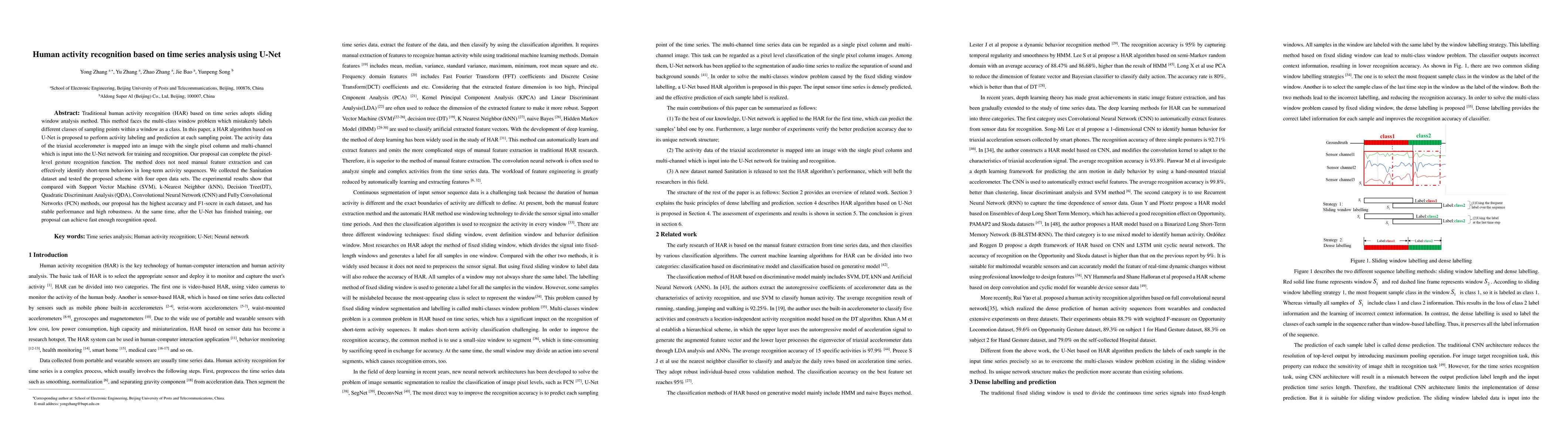 Traditional human activity recognition (HAR) based on time series adopts sliding window analysis method. This method faces the multi-class window problem which mistakenly labels different classes of sampling points within a window as a class. In this paper, a HAR algorithm based on U-Net is proposed to perform activity labeling and prediction at each sampling point. The activity data of the triaxial accelerometer is mapped into an image with the single pixel column and multi-channel which is input into the U-Net network for training and recognition. Our proposal can complete the pixel-level gesture recognition function. The method does not need manual feature extraction and can effectively identify short-term behaviors in long-term activity sequences. We collected the Sanitation dataset and tested the proposed scheme with four open data sets. The experimental results show that compared with Support Vector Machine (SVM), k-Nearest Neighbor (kNN), Decision Tree(DT), Quadratic Discriminant Analysis (QDA), Convolutional Neural Network (CNN) and Fully Convolutional Networks (FCN) methods, our proposal has the highest accuracy and F1-socre in each dataset, and has stable performance and high robustness. At the same time, after the U-Net has finished training, our proposal can achieve fast enough recognition speed.