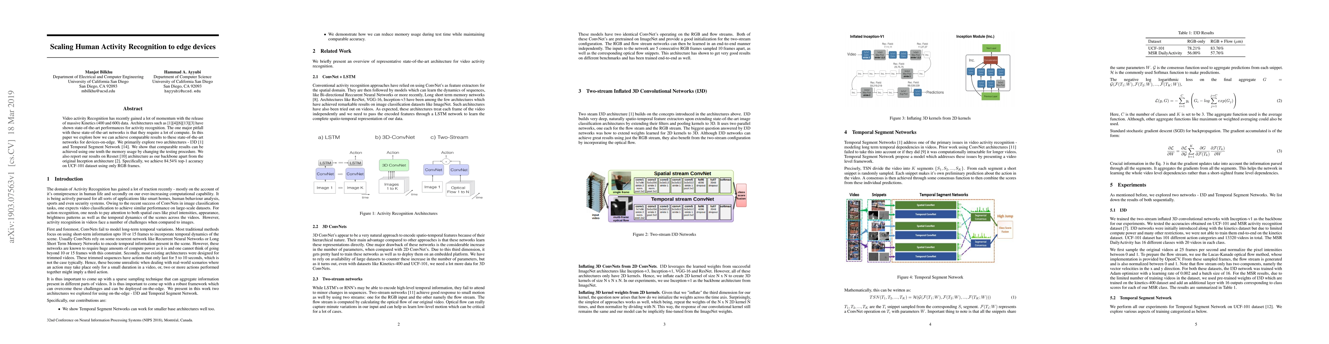Video activity Recognition has recently gained a lot of momentum with the release of massive Kinetics (400 and 600) data. Architectures such as I3D and C3D networks have shown state-of-the-art performances for activity recognition. The one major pitfall with these state-of-the-art networks is that they require a lot of compute. In this paper we explore how we can achieve comparable results to these state-of-the-art networks for devices-on-edge. We primarily explore two architectures - I3D and Temporal Segment Network. We show that comparable results can be achieved using one tenth the memory usage by changing the testing procedure. We also report our results on Resnet architecture as our backbone apart from the original Inception architecture. Specifically, we achieve 84.54\% top-1 accuracy on UCF-101 dataset using only RGB frames.