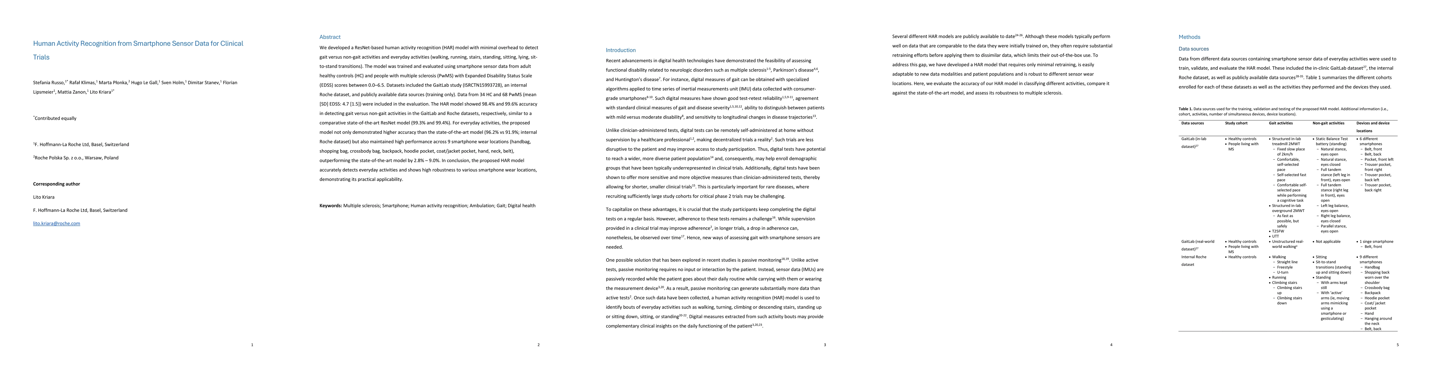 We developed a ResNet-based human activity recognition (HAR) model with minimal overhead to detect gait versus non-gait activities and everyday activities (walking, running, stairs, standing, sitting, lying, sit-to-stand transitions). The model was trained and evaluated using smartphone sensor data from adult healthy controls (HC) and people with multiple sclerosis (PwMS) with Expanded Disability Status Scale (EDSS) scores between 0.0-6.5. Datasets included the GaitLab study (ISRCTN15993728), an internal Roche dataset, and publicly available data sources (training only). Data from 34 HC and 68 PwMS (mean [SD] EDSS: 4.7 [1.5]) were included in the evaluation. The HAR model showed 98.4% and 99.6% accuracy in detecting gait versus non-gait activities in the GaitLab and Roche datasets, respectively, similar to a comparative state-of-the-art ResNet model (99.3% and 99.4%). For everyday activities, the proposed model not only demonstrated higher accuracy than the state-of-the-art model (96.2% vs 91.9%; internal Roche dataset) but also maintained high performance across 9 smartphone wear locations (handbag, shopping bag, crossbody bag, backpack, hoodie pocket, coat/jacket pocket, hand, neck, belt), outperforming the state-of-the-art model by 2.8% - 9.0%. In conclusion, the proposed HAR model accurately detects everyday activities and shows high robustness to various smartphone wear locations, demonstrating its practical applicability.