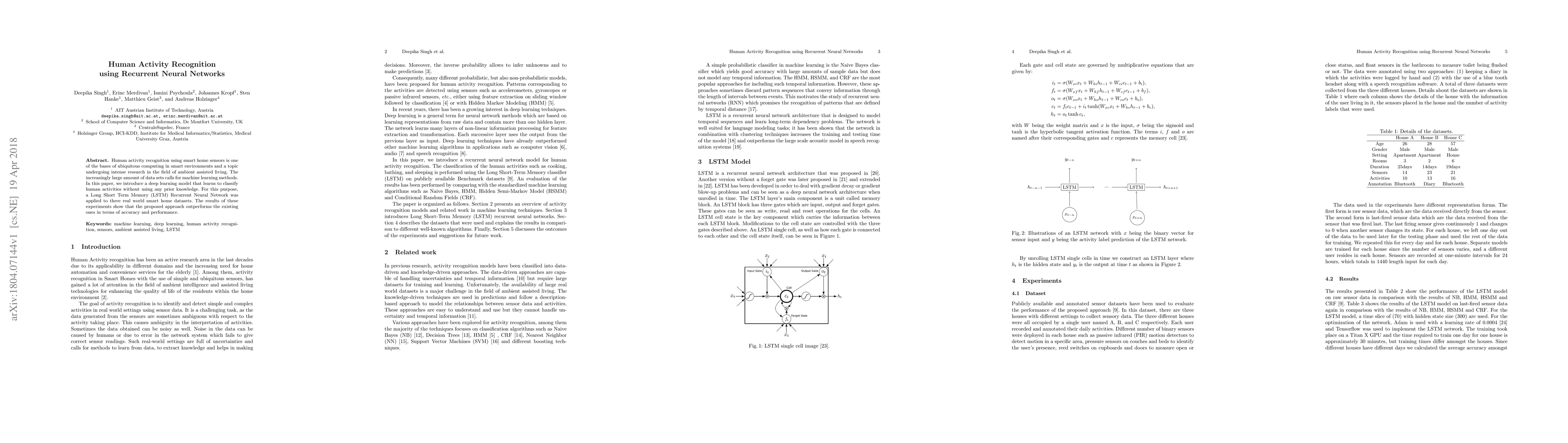 This paper proposes a Long Short Term Memory (LSTM) Recurrent Neural Network for human activity recognition using smart home sensor data, achieving superior accuracy and performance compared to existing methods without requiring prior knowledge.