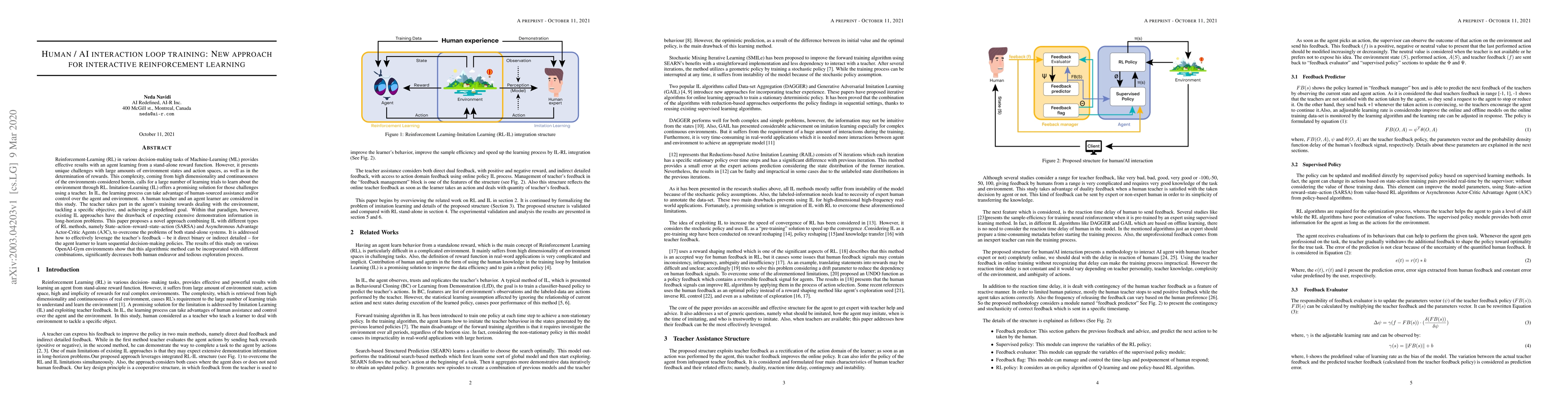 Reinforcement Learning (RL) in various decision-making tasks of machine learning provides effective results with an agent learning from a stand-alone reward function. However, it presents unique challenges with large amounts of environment states and action spaces, as well as in the determination of rewards. This complexity, coming from high dimensionality and continuousness of the environments considered herein, calls for a large number of learning trials to learn about the environment through Reinforcement Learning. Imitation Learning (IL) offers a promising solution for those challenges using a teacher. In IL, the learning process can take advantage of human-sourced assistance and/or control over the agent and environment. A human teacher and an agent learner are considered in this study. The teacher takes part in the agent training towards dealing with the environment, tackling a specific objective, and achieving a predefined goal. Within that paradigm, however, existing IL approaches have the drawback of expecting extensive demonstration information in long-horizon problems. This paper proposes a novel approach combining IL with different types of RL methods, namely state action reward state action (SARSA) and asynchronous advantage actor-critic (A3C) agents, to overcome the problems of both stand-alone systems. It is addressed how to effectively leverage the teacher feedback, be it direct binary or indirect detailed for the agent learner to learn sequential decision-making policies. The results of this study on various OpenAI Gym environments show that this algorithmic method can be incorporated with different combinations, significantly decreases both human endeavor and tedious exploration process.
