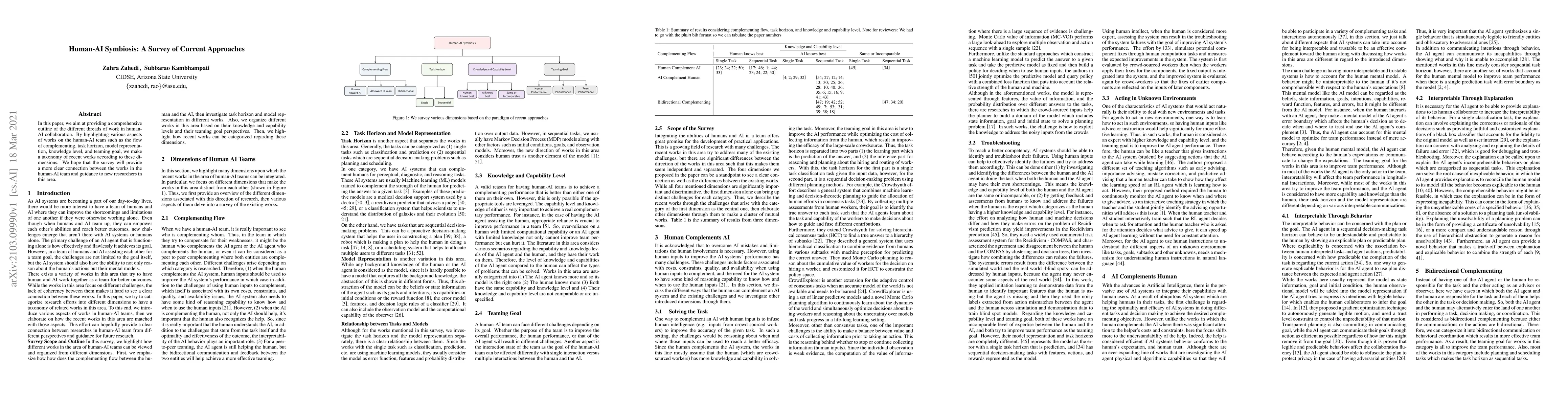 In this paper, we aim at providing a comprehensive outline of the different threads of work in human-AI collaboration. By highlighting various aspects of works on the human-AI team such as the flow of complementing, task horizon, model representation, knowledge level, and teaming goal, we make a taxonomy of recent works according to these dimensions. We hope that the survey will provide a more clear connection between the works in the human-AI team and guidance to new researchers in this area.