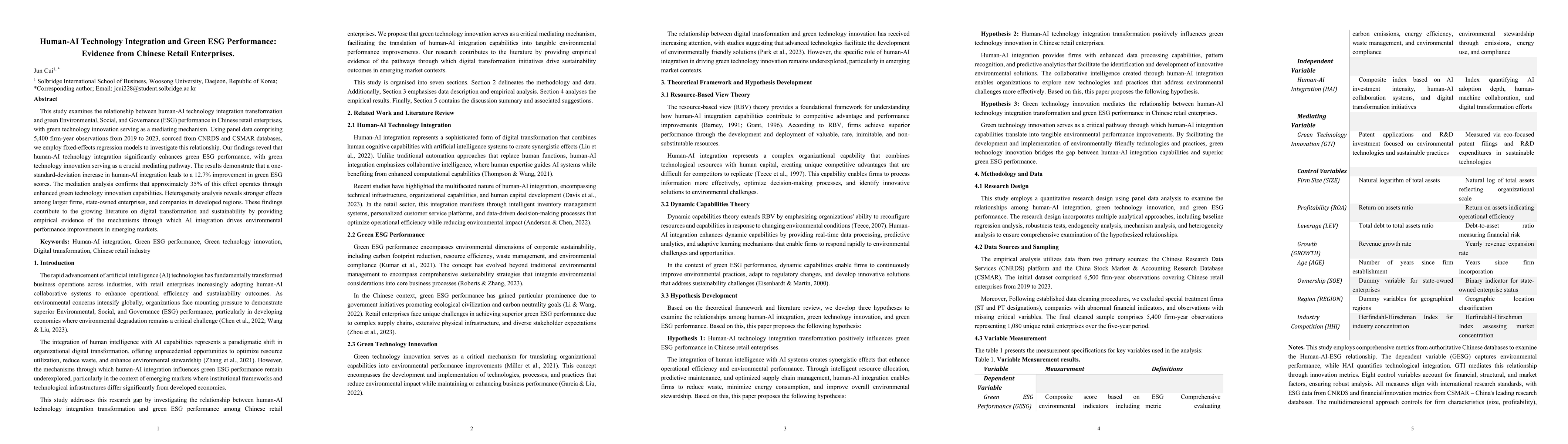 This study examines the relationship between human-AI technology integration transformation and green Environmental, Social, and Governance (ESG) performance in Chinese retail enterprises, with green technology innovation serving as a mediating mechanism. Using panel data comprising 5,400 firm-year observations from 2019 to 2023, sourced from CNRDS and CSMAR databases, we employ fixed-effects regression models to investigate this relationship. Our findings reveal that human-AI technology integration significantly enhances green ESG performance, with green technology innovation serving as a crucial mediating pathway. The results demonstrate that a one standard-deviation increase in human-AI integration leads to a 12.7% improvement in green ESG scores. The mediation analysis confirms that approximately 35% of this effect operates through enhanced green technology innovation capabilities. Heterogeneity analysis reveals stronger effects among larger firms, state-owned enterprises, and companies in developed regions. These findings contribute to the growing literature on digital transformation and sustainability by providing empirical evidence of the mechanisms through which AI integration drives environmental performance improvements in emerging markets.
