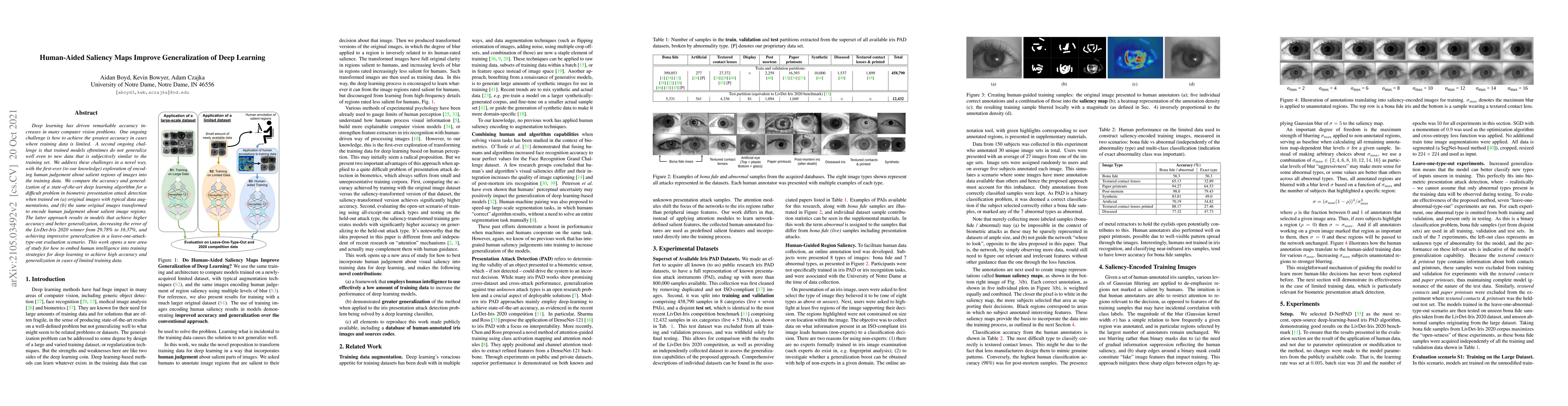 This research introduces a novel method using human-aided saliency maps to enhance deep learning model accuracy and generalization, particularly with limited training data. The approach significantly improves presentation attack detection in biometrics, reducing error rates and demonstrating strong generalization capabilities.