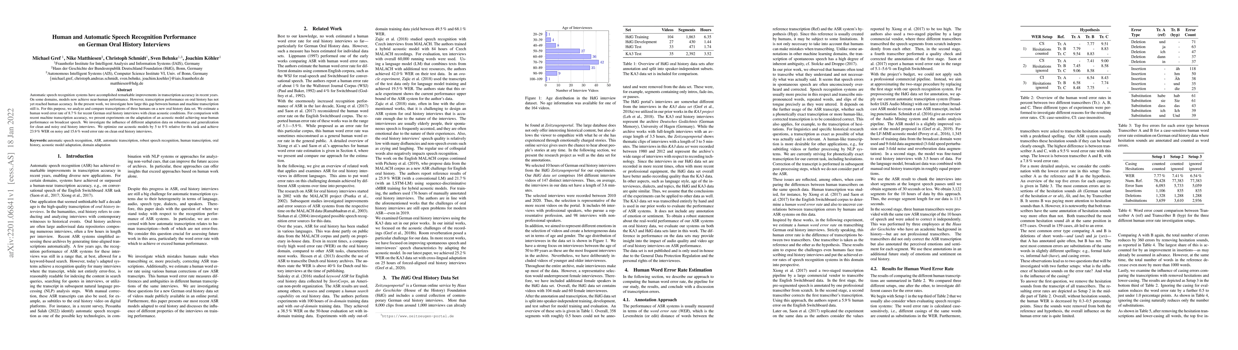 Automatic speech recognition systems have accomplished remarkable improvements in transcription accuracy in recent years. On some domains, models now achieve near-human performance. However, transcription performance on oral history has not yet reached human accuracy. In the present work, we investigate how large this gap between human and machine transcription still is. For this purpose, we analyze and compare transcriptions of three humans on a new oral history data set. We estimate a human word error rate of 8.7% for recent German oral history interviews with clean acoustic conditions. For comparison with recent machine transcription accuracy, we present experiments on the adaptation of an acoustic model achieving near-human performance on broadcast speech. We investigate the influence of different adaptation data on robustness and generalization for clean and noisy oral history interviews. We optimize our acoustic models by 5 to 8% relative for this task and achieve 23.9% WER on noisy and 15.6% word error rate on clean oral history interviews.