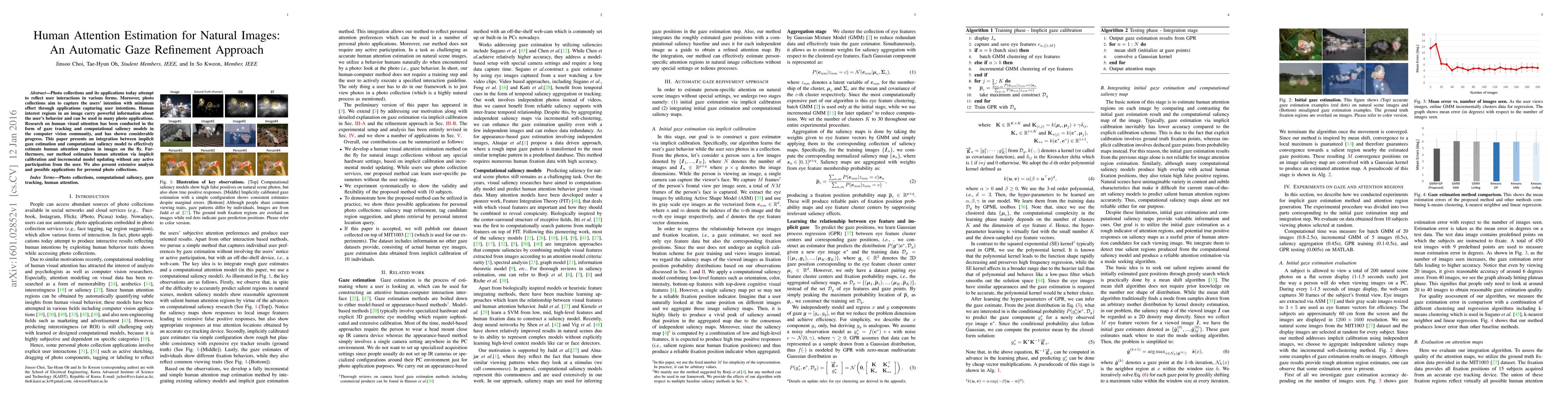 This paper proposes an automatic method for refining gaze estimation in natural images by integrating implicit calibration with computational saliency models, allowing for real-time human attention estimation without user input. The approach demonstrates potential applications in enhancing personal photo collections by reflecting user intentions.