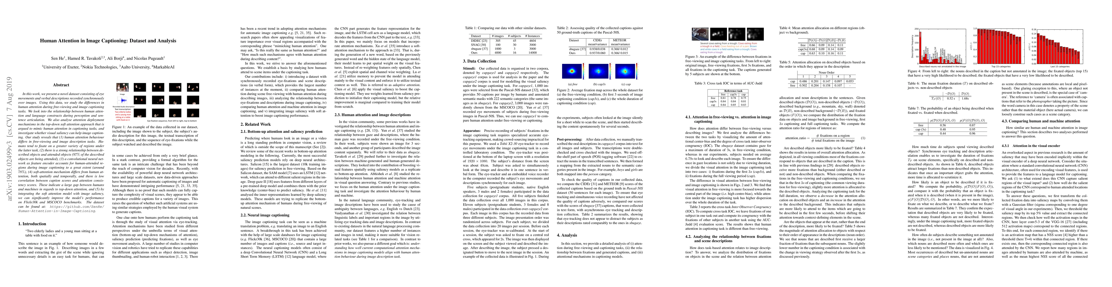 This paper introduces a dataset capturing eye movements and verbal descriptions during image captioning, revealing differences in human attention between free-viewing and captioning tasks. The study finds that humans attend more broadly when captioning, with a strong link between described objects and attended regions, while machine attention models lag behind human attention and integrating saliency improves model performance.