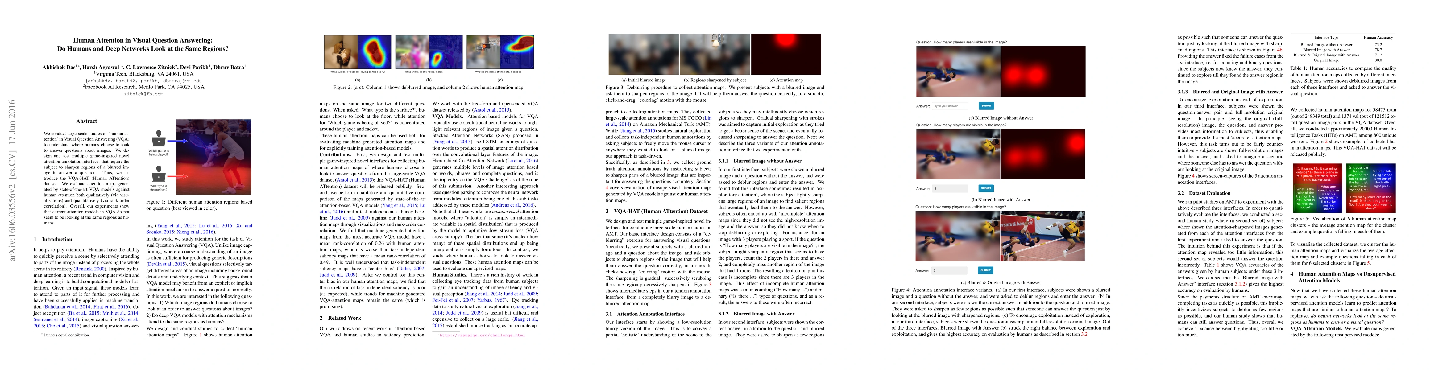This paper investigates human attention in Visual Question Answering (VQA) by creating the VQA-HAT dataset using game-inspired interfaces. It finds that state-of-the-art VQA models do not match human attention regions, both qualitatively and quantitatively.