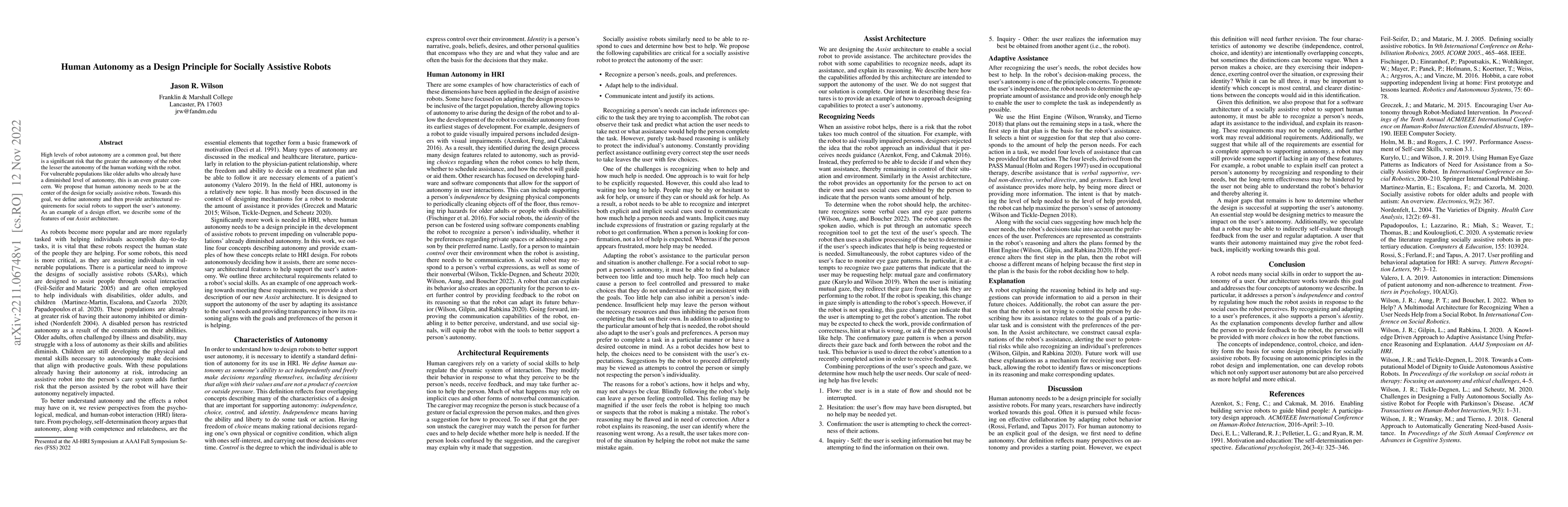 This paper argues that human autonomy should be a primary design principle for socially assistive robots, especially for vulnerable populations. It proposes architectural requirements to support user autonomy and illustrates these principles with features of the Assist architecture.