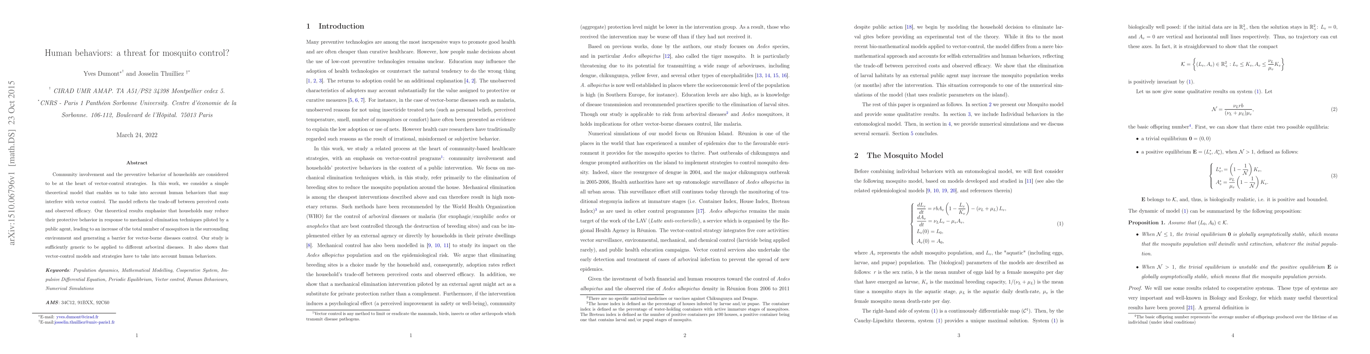 Community involvement and the preventive behavior of households are considered to be at the heart of vector-control strategies. In this work, we consider a simple theoretical model that enables us to take into account human behaviors that may interfere with vector control. The model reflects the trade-off between perceived costs and observed efficacy. Our theoretical results emphasize that households may reduce their protective behavior in response to mechanical elimination techniques piloted by a public agent, leading to an increase of the total number of mosquitoes in the surrounding environment and generating a barrier for vector-borne diseases control. Our study is sufficiently generic to be applied to different arboviral diseases. It also shows that vector-control models and strategies have to take into account human behaviors.