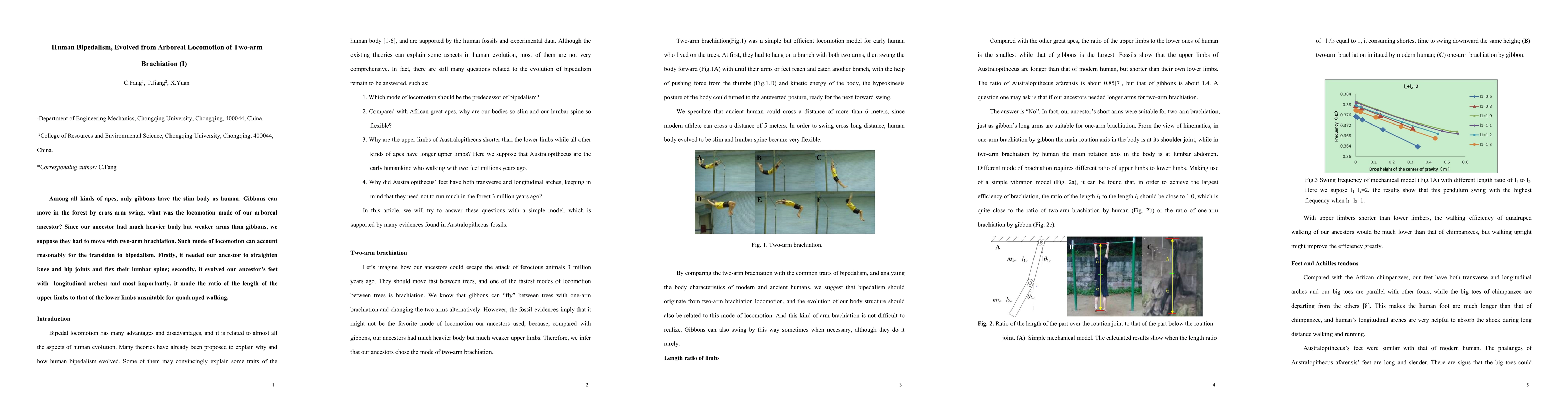 Among all kinds of apes, only gibbons have the slim body as human. Gibbons can move in the forest by cross arm swing, what was the locomotion mode of our arboreal ancestor. Since our ancestor had much heavier body but weaker arms than gibbons, we suppose they had to move with two arm brachiation. Such mode of locomotion can account reasonably for the transition to bipedalism. Firstly, it needed our ancestor to straighten knee and hip joints and flex their lumbar spine. secondly, it evolved the feet of our ancestor with longitudinal arche. And most importantly, it made the ratio of the length of the upper limbs to that of the lower limbs unsuitable for quadruped walking.