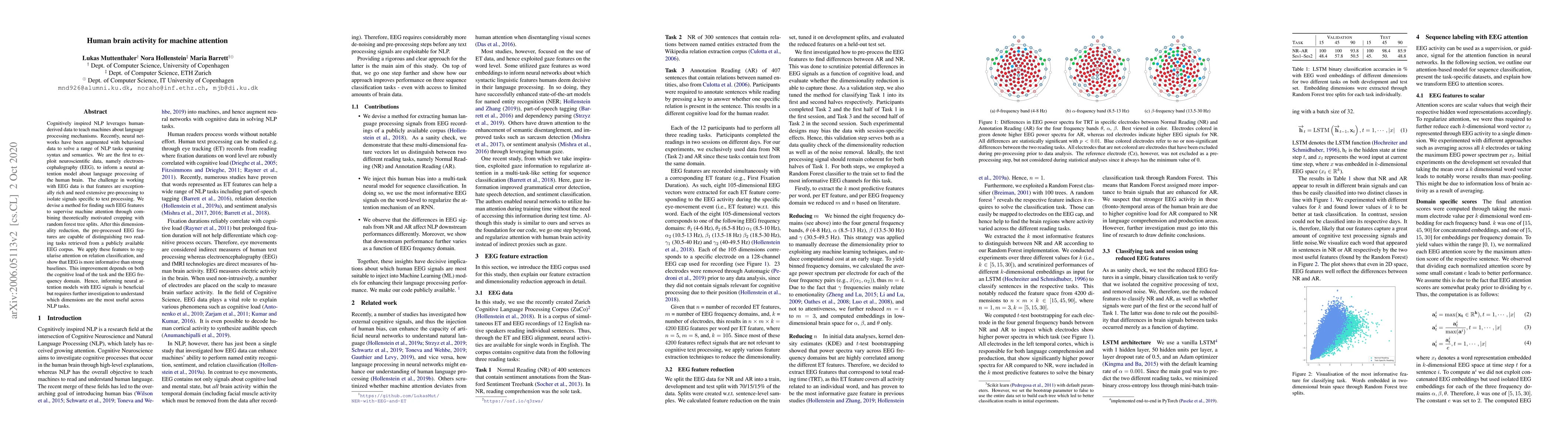 Cognitively inspired NLP leverages human-derived data to teach machines about language processing mechanisms. Recently, neural networks have been augmented with behavioral data to solve a range of NLP tasks spanning syntax and semantics. We are the first to exploit neuroscientific data, namely electroencephalography (EEG), to inform a neural attention model about language processing of the human brain. The challenge in working with EEG data is that features are exceptionally rich and need extensive pre-processing to isolate signals specific to text processing. We devise a method for finding such EEG features to supervise machine attention through combining theoretically motivated cropping with random forest tree splits. After this dimensionality reduction, the pre-processed EEG features are capable of distinguishing two reading tasks retrieved from a publicly available EEG corpus. We apply these features to regularise attention on relation classification and show that EEG is more informative than strong baselines. This improvement depends on both the cognitive load of the task and the EEG frequency domain. Hence, informing neural attention models with EEG signals is beneficial but requires further investigation to understand which dimensions are the most useful across NLP tasks.